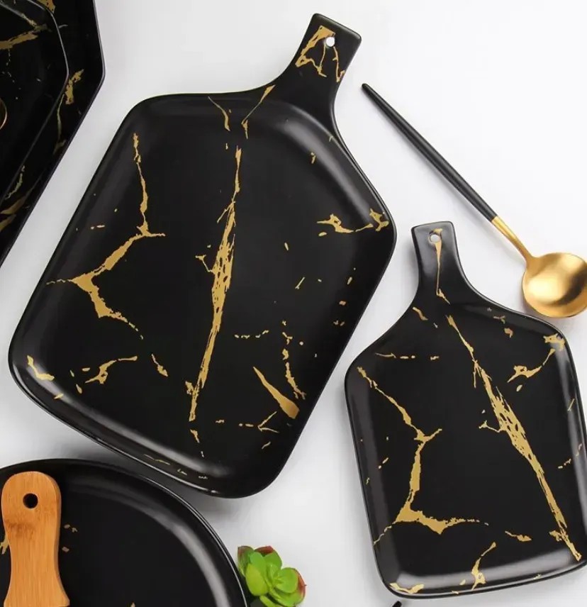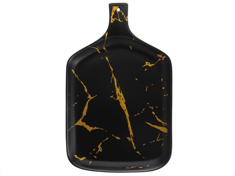 Стильное фарфоровое блюдо длиной 32 см — это эффектный акцент на любом столе. Глубокий матовый чёрный фон в сочетании с изысканным золотым мраморным рисунком создаёт элегантный и современный образ. Благодаря оригинальной форме с ручкой изделие выглядит не только декоративно, но и чрезвычайно удобно в использовании: его легко переносить, сервировать блюда и подавать угощения с особым изяществом.