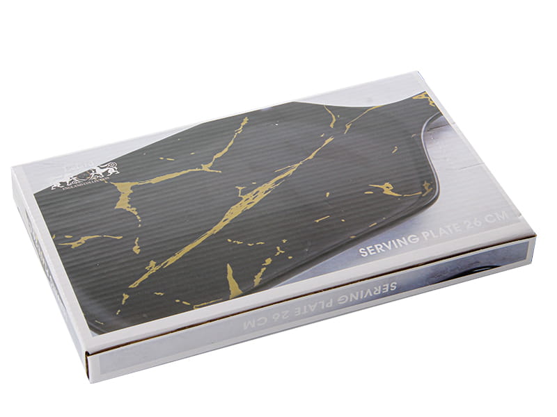 Такое блюдо идеально подходит для подачи закусок, десертов, фруктов, канапе или сыров, превращая обычную трапезу в стильное событие. Яркий контраст чёрного и золотого цвета придаёт сервировке праздничный, даже немного гламурный характер, подчёркивая утончённый вкус хозяев.