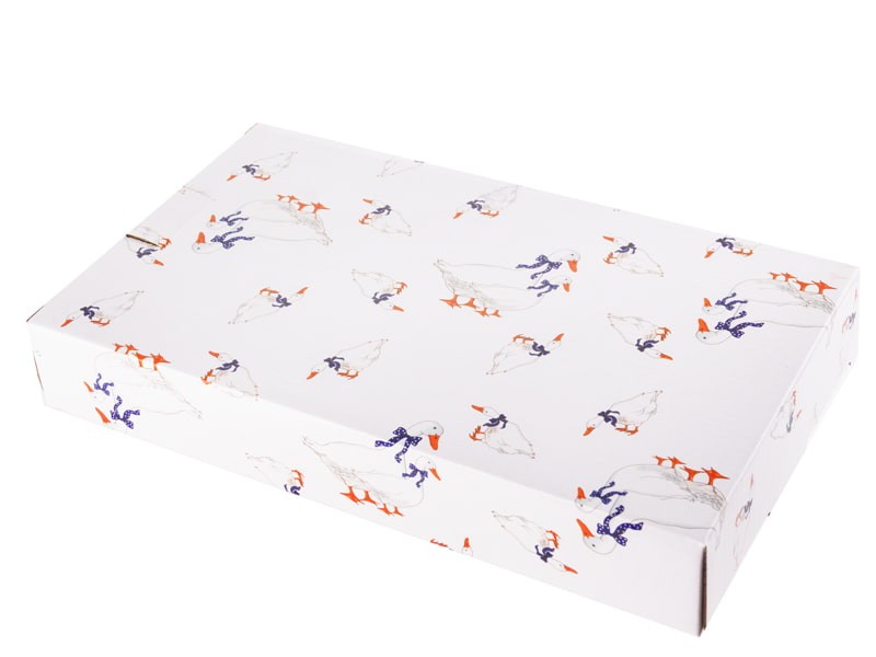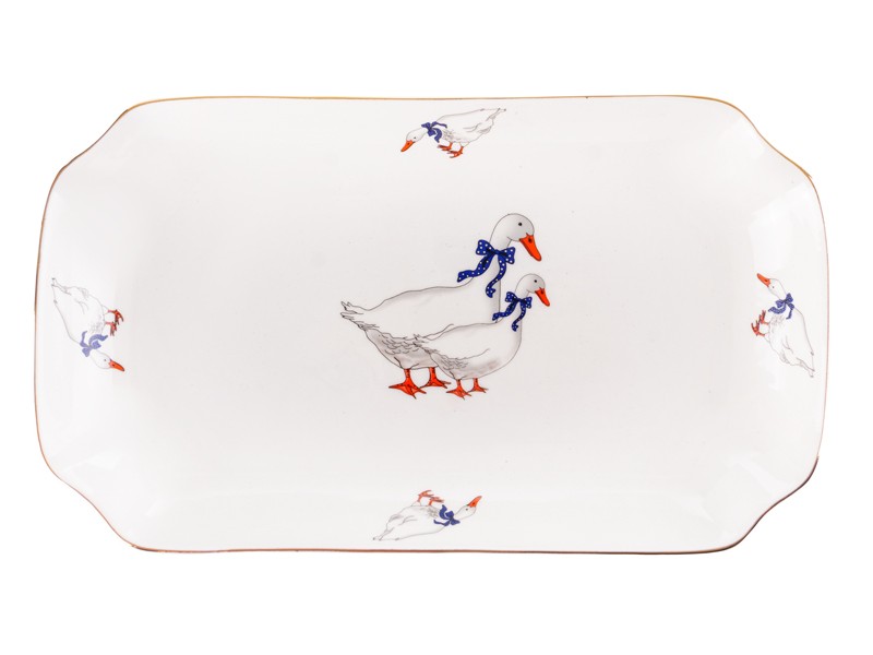 Милейшее фарфоровое блюдо «Гуси» — это изысканное сочетание классического белоснежного фона и милого рисунка с утками в синих бантах. Прямоугольная форма с плавно изогнутыми краями придаёт изделию элегантность, а тонкая золотистая окантовка по периметру подчёркивает утончённый стиль. Такой дизайн идеально впишется как в традиционный, так и в современный интерьер кухни или столовой.