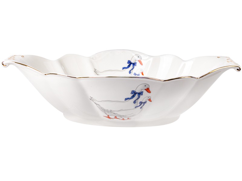 Блюдо «Гуси» — это изысканное сочетание классической формы и милейшего дизайна. Белоснежный фарфор украшен рисунками забавных гусей с синими бантиками, а плавные волнистые края подчёркнуты утончённой золотистой окантовкой. Такой декоративный элемент сразу привлекает внимание и создаёт уютную, домашнюю атмосферу на вашем столе.