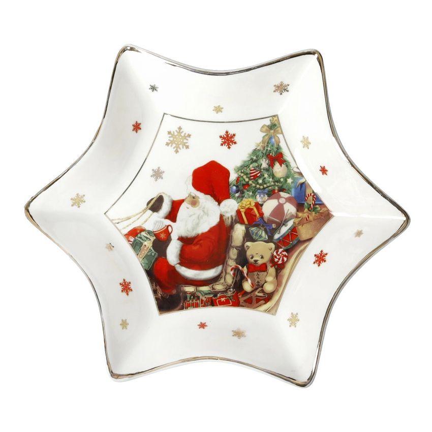 Фарфоровое блюдо в форме звезды Christmas Brandani создано для аккуратной и эффектной подачи десертов, фруктов и небольших закусок. Его звёздная форма привлекает внимание и выделяет блюдо среди стандартной сервировки. Центральная часть украшена детальным рисунком с Санта-Клаусом и подарками, выполненным в насыщенных устойчивых цветах. Качественный фарфор делает изделие прочным, гладким и удобным в использовании. Блюдо подходит как для ежедневной праздничной сервировки, так и для тематического новогоднего стола. Это практичный и эстетичный элемент сервиза, который дополняет коллекцию сезонной посуды.