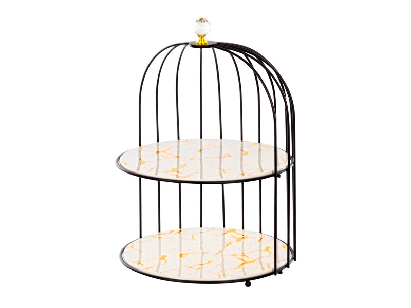 Благодаря вертикальной конструкции блюдо экономит место и позволяет удобно разместить разные виды угощений на двух уровнях. Оно отлично подходит для подачи пирожных, фруктов, конфет, мини-десертов или закусок. Гладкая поверхность фарфора легко очищается, а металлическая рама обеспечивает устойчивость и долговечность изделия.