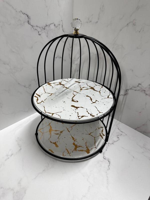 Двухъярусное блюдо 25×38 см — это практичный и выразительный элемент сервировки, который помогает аккуратно организовать пространство на столе. Основа выполнена из прочного металла в виде куполообразной конструкции с чёрным матовым покрытием. Верхняя часть украшена прозрачной декоративной ручкой, которая придаёт изделию завершённый вид. Два круглых фарфоровых яруса с мраморным узором и золотыми прожилками выглядят стильно и современно, подчёркивая аккуратность и вкус в оформлении.