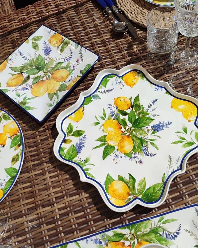 Фарфоровое квадратное блюдо Soraya Maison с синей окантовкой украшено сочными лимонами и зелёными листьями — символом свежести и южного солнца. Эффектная форма с приподнятыми краями подчёркивает утончённость дизайна и делает блюдо удобным для подачи.