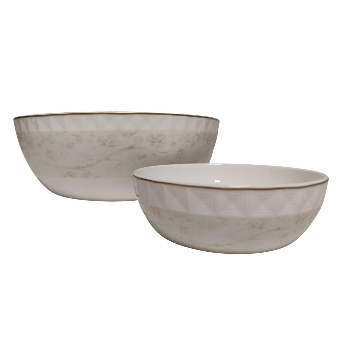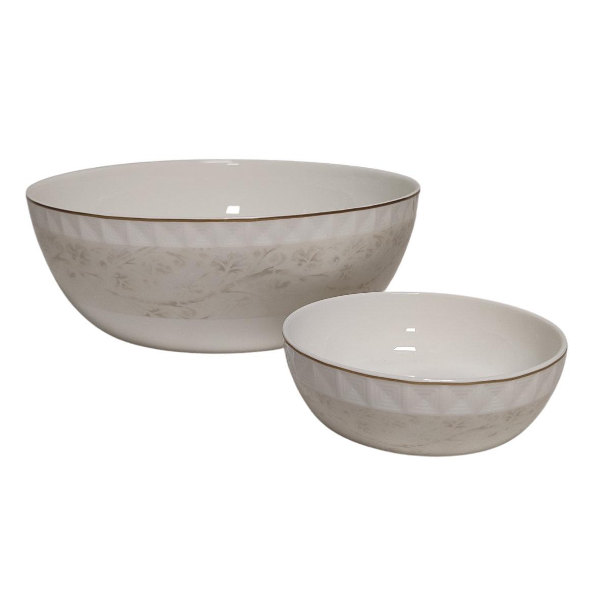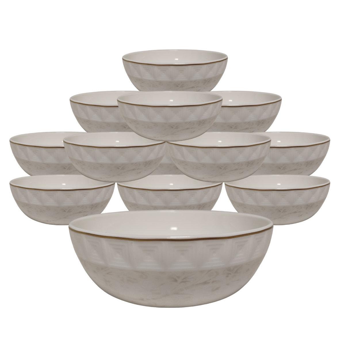 Фарфоровый набор Venus Tognana включает 12 пиал и один салатник, оформленных в сдержанном современном дизайне с мягким геометрическим узором. Такой комплект подойдёт для сервировки супов, закусок и десертов, добавив столу гармоничности и стиля.