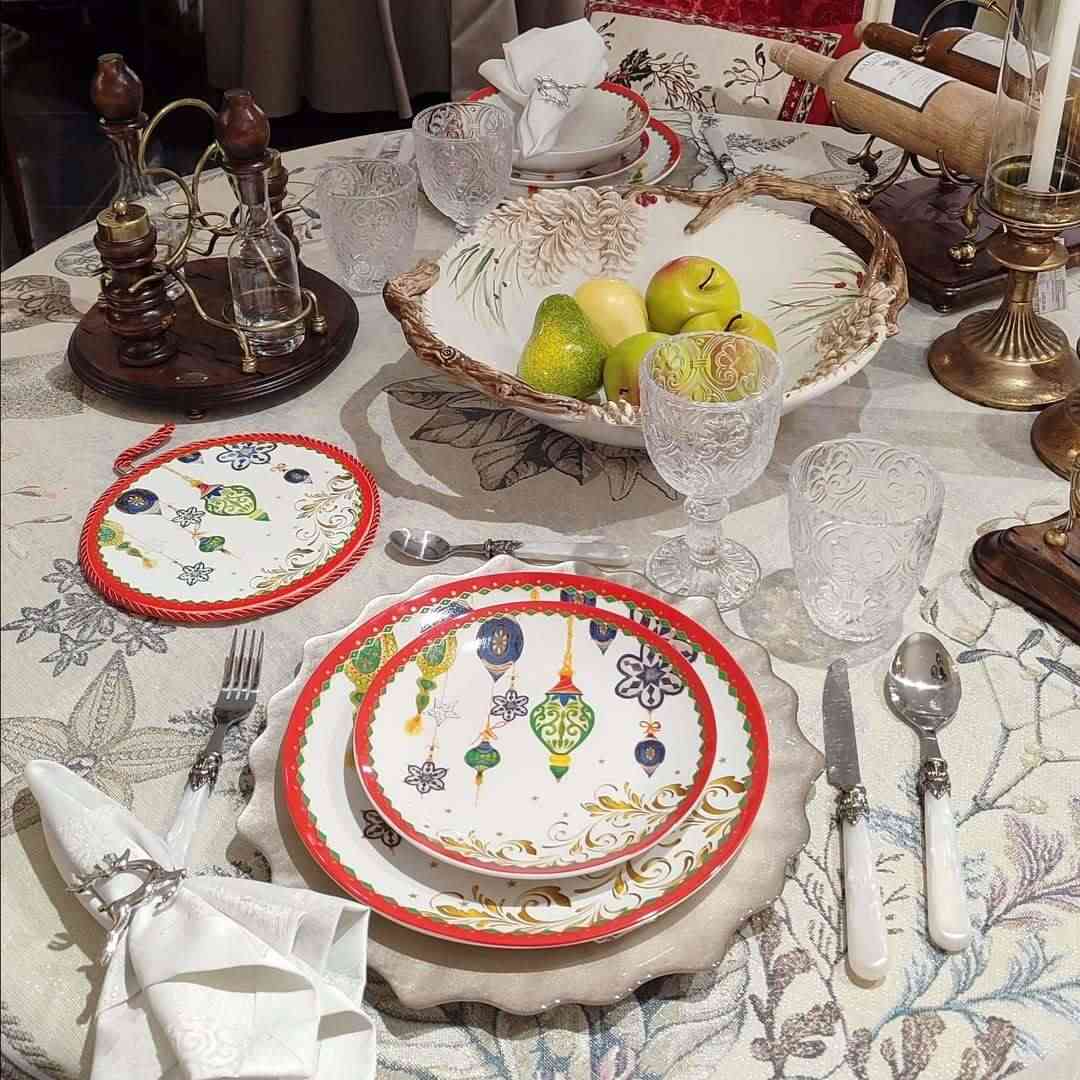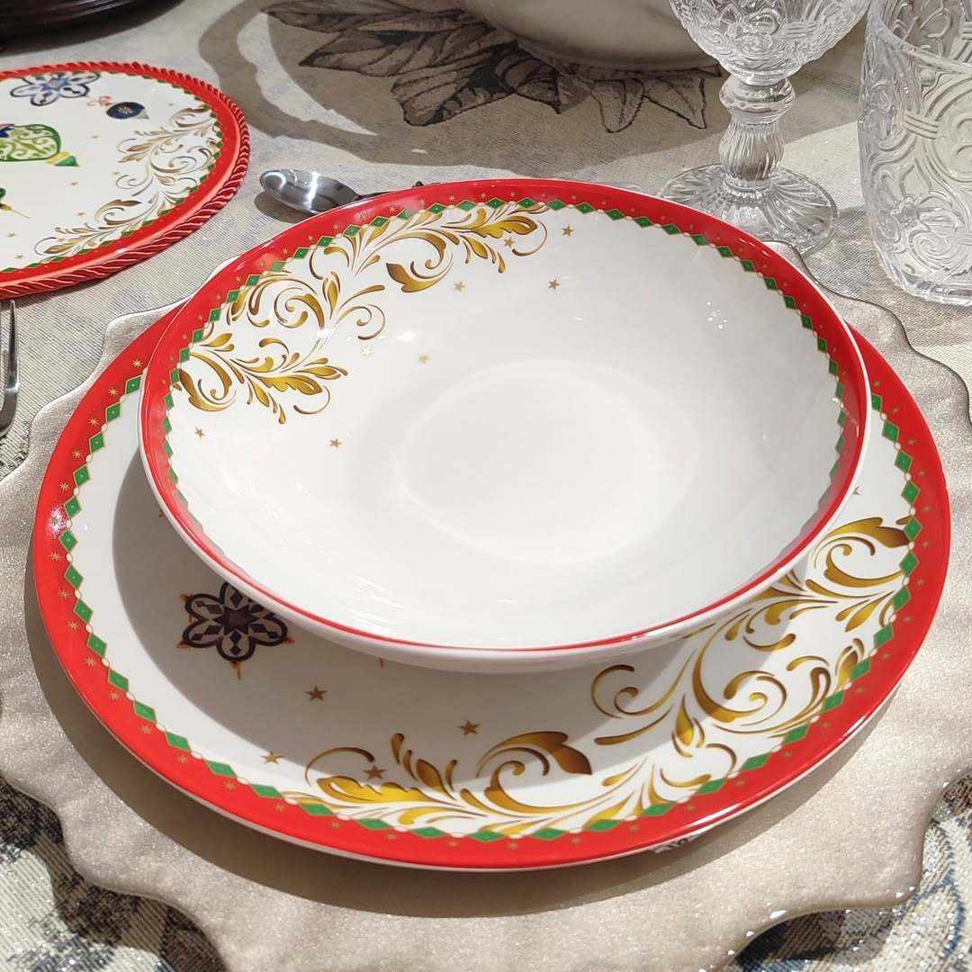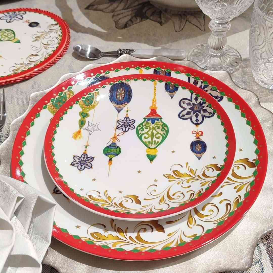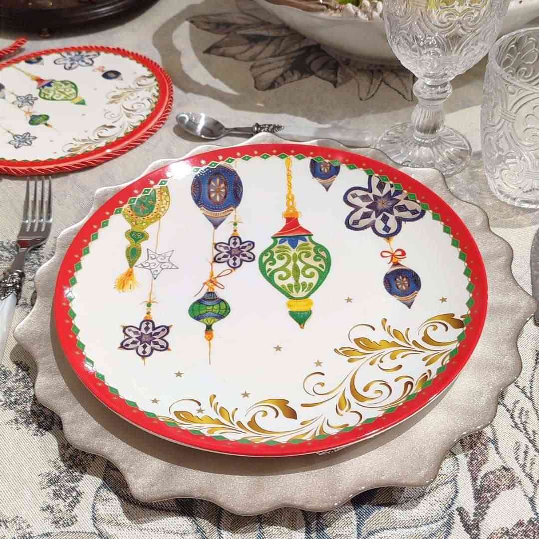 Фарфоровый набор из 3-х тарелок Terna Piatti Christmas Arca создаёт праздничное настроение с первых минут. На белоснежной поверхности сверкают рождественские игрушки в золотом и изумрудном оформлении. Каждая тарелка украшена красной каймой, подчёркивающей элегантность сервировки. Диаметры 27, 21 и 21 см идеально подходят для основного блюда, салата и десерта. Изготовленные из прочного фарфора, тарелки устойчивы к ежедневному использованию и сохраняют яркость рисунка. Прекрасный вариант для праздничного ужина или подарка к Новому году.