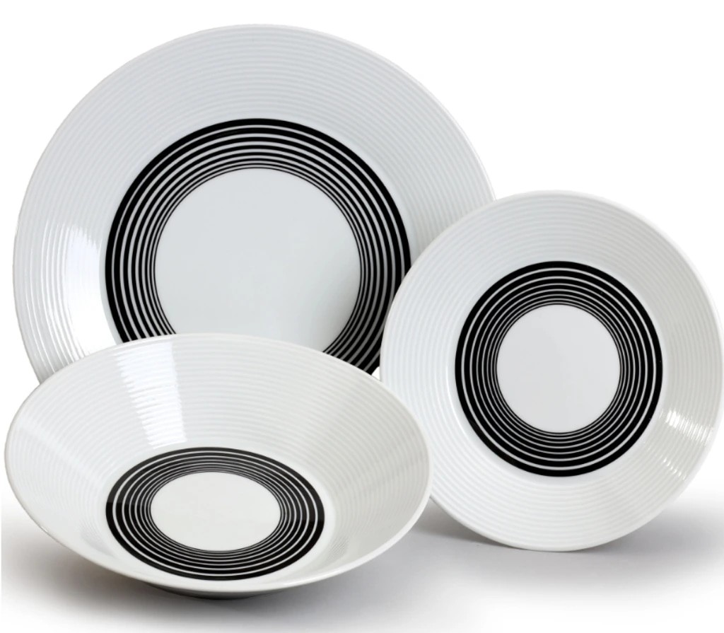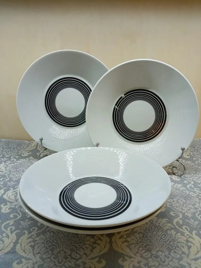 Высококачественный твердый фарфор белого цвета с рифленными краями и черными полосами. Прочная структура и устойчивость к сколам позволяет пользоваться данной посудой каждый день.