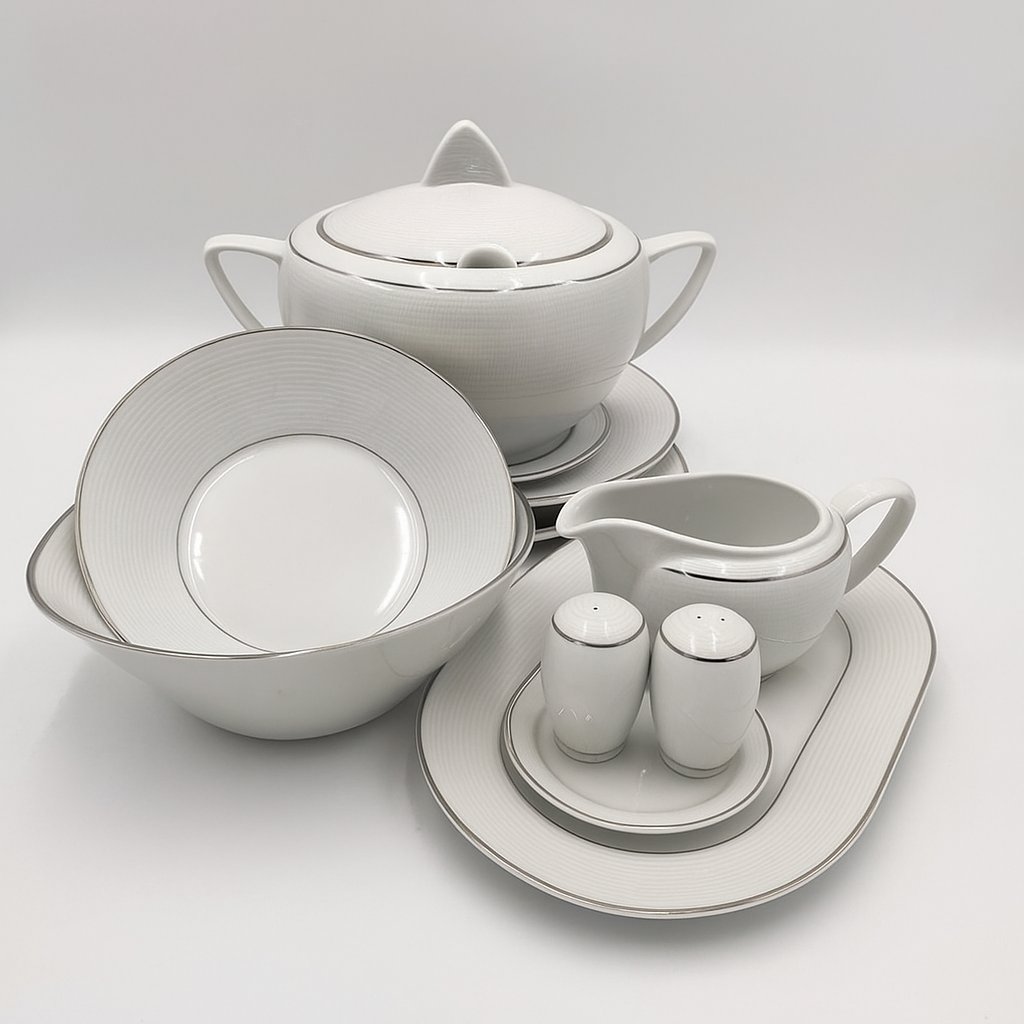 Белоснежный фарфор, украшенный платиновым кантом, сияет благородством и тонкостью. Каждая деталь сервиза продумана до мелочей — от изящных линий тарелок до плавных форм соусника и салатниц. Платиновая обводка добавляет изысканности и торжественности, делая сервиз идеальным выбором как для повседневных обедов, так и для праздничных ужинов.