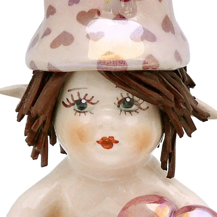 Фигурка "Эльф с сердцем" от Zampiva — фарфоровое изделие высотой 12 см, выполненное вручную. Модель изображает персонажа в костюме эльфа, держащего сердце. Цветовая гамма — пастельная, с элементами ручной росписи. Характерные черты: округлая форма, стилизованные детали, упрощённые facial-элементы.