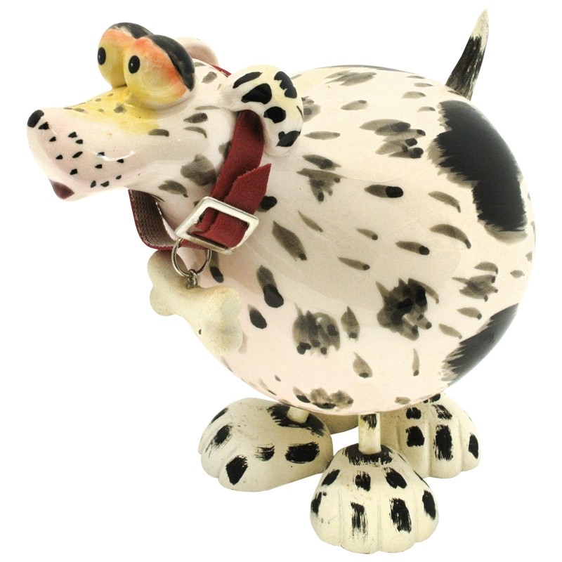 Фігурка білого пса з чорними цятками. Якщо трохи нахилити та відпустити, то Пес-позитив буде весело гойдатись та підстрибувати.