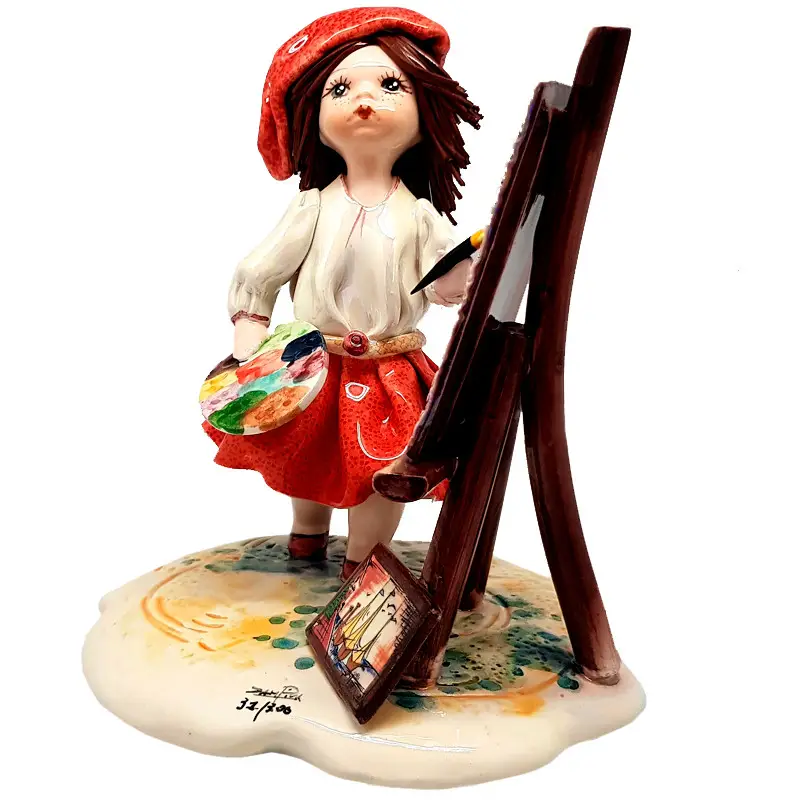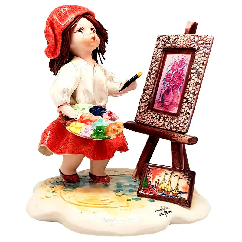 Фигурка "Моя первая картина" от Zampiva — фарфоровое изделие ручной работы, выполненное в характерной авторской стилистике бренда. Высота модели — 16,5 см, длина — 17,5 см. Изображает ребёнка у мольберта, в процессе создания своего первого рисунка — с красками, кистями и характерной сосредоточенностью на лице.