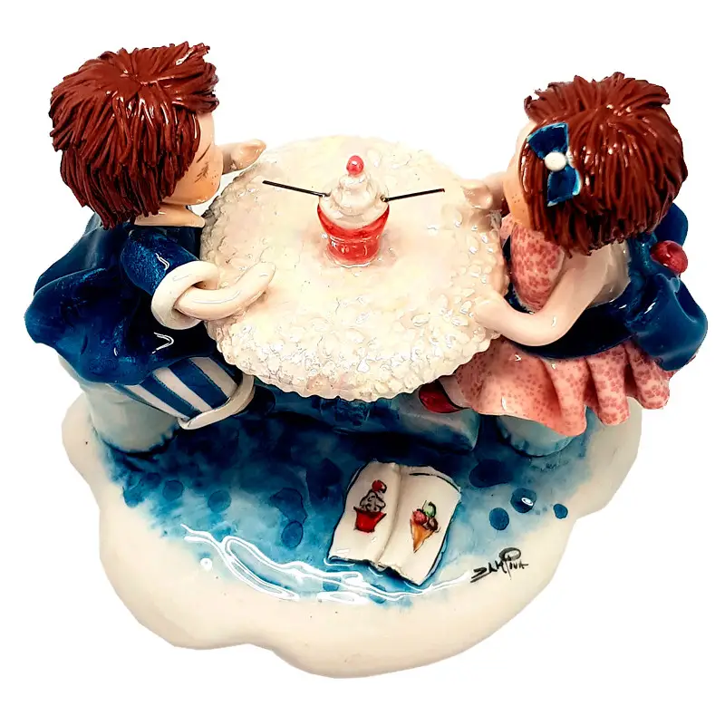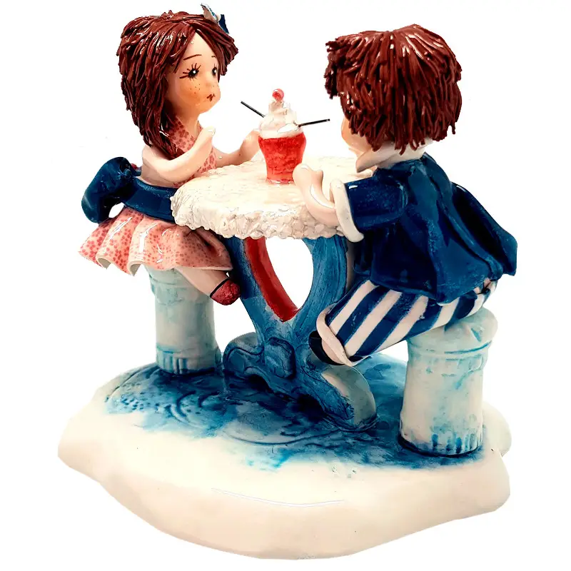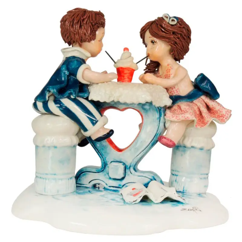 Фігурка "Перше побачення" від Zampiva — витончений порцеляновий виріб ручної роботи, що передає зворушливий момент першої зустрічі. Розміри — 15×16,5 см. Композиція зображує юнака та дівчину, які сидять поруч, трохи сором’язливі, але щиро захоплені одне одним.