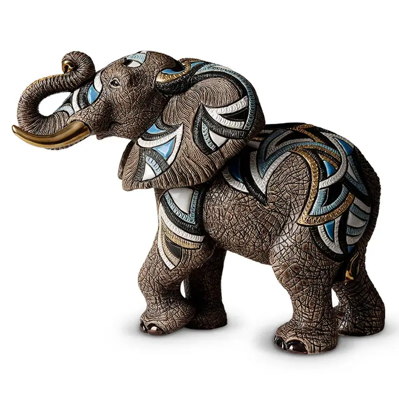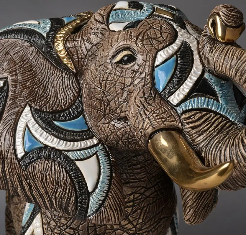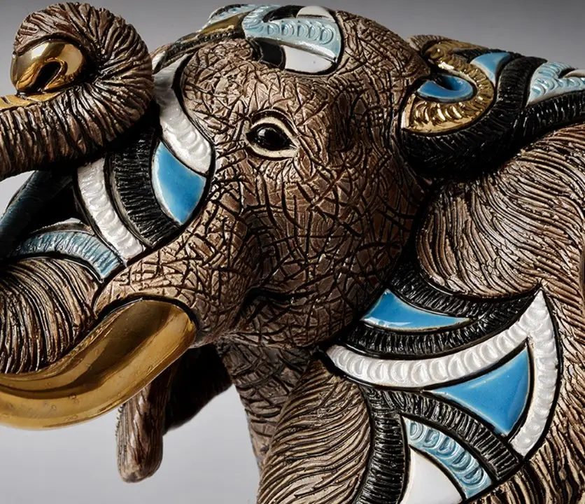 Слон изображён в величественной и спокойной позе, с поднятым хоботом — символом удачи. Мастера De Rosa Rinconada оформили изделие в насыщенных, тёплых оттенках с рельефной ручной отделкой, эмалями и позолотой. Текстура поверхности сочетает матовые и глянцевые элементы, подчёркивая детали ушей, бивней и кожи.