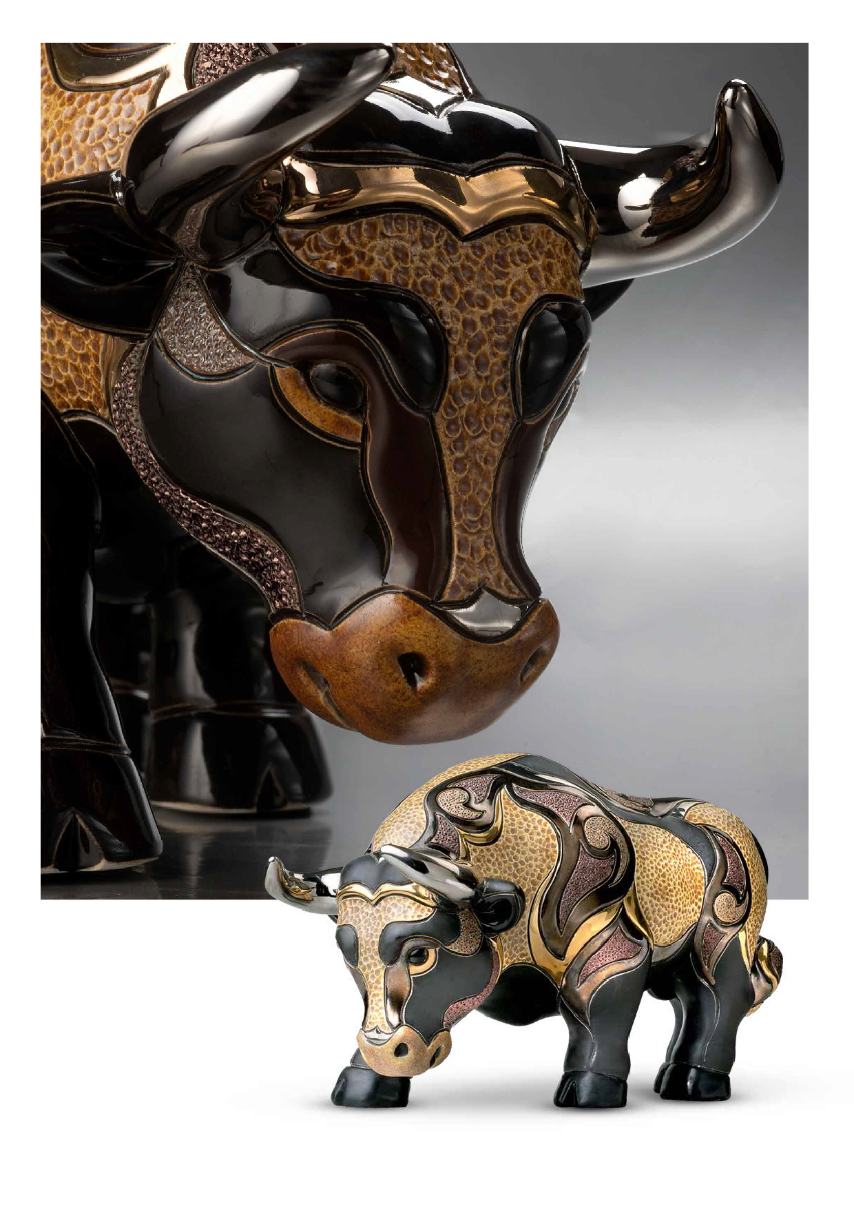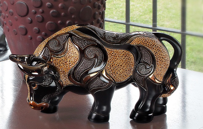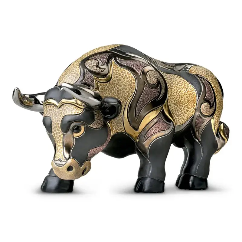 Символ сили, впевненості та стабільності, бик зображений у динамічній позі з піднятою головою та виразною мускулатурою. Кожна деталь ретельно опрацьована вручну: від рельєфної текстури до контрастної кольорової палітри із золотими акцентами. Поєднання матових і глянцевих поверхонь надає об’єм і глибину, підкреслюючи художню виразність фігурки.