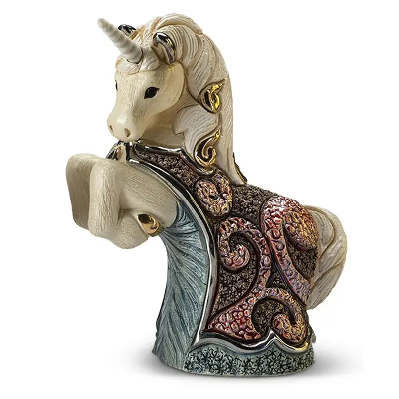 Фігурка "Єдиноріг (блакитний)" від De Rosa Rinconada — це декоративний виріб, виготовлений з кераміки з елементами ручної роботи. Розміри фігурки — 14×6×11 см. Вона зображує стилізованого єдинорога з оздобленням у холодних синьо-блакитних тонах і золотистими акцентами.