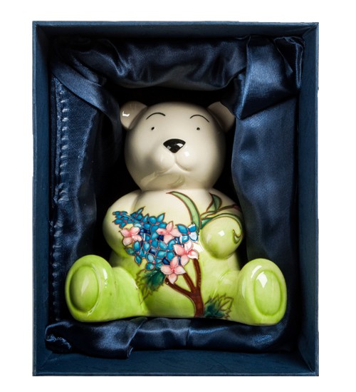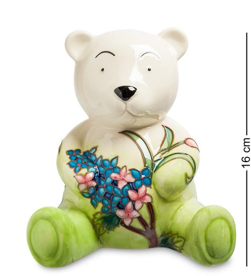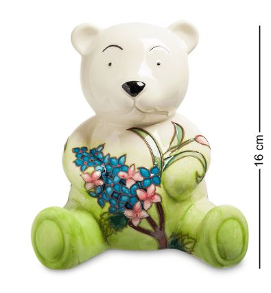 Миловидний ведмедик, що викликає усмішку - це не просто скарбничка, він неначе маленьке диво. Ніжні кольори, перехід від білого до світло-зеленого, маленькі лапи роблять його ще милим і привабливим. Квіти, які він тримає в лапах насиченого рожевого та блакитного кольорів, надають йому привабливості, яскравості та грайливості. Скарбничка зможе стати чудовим сховищем для ваших заощаджень.