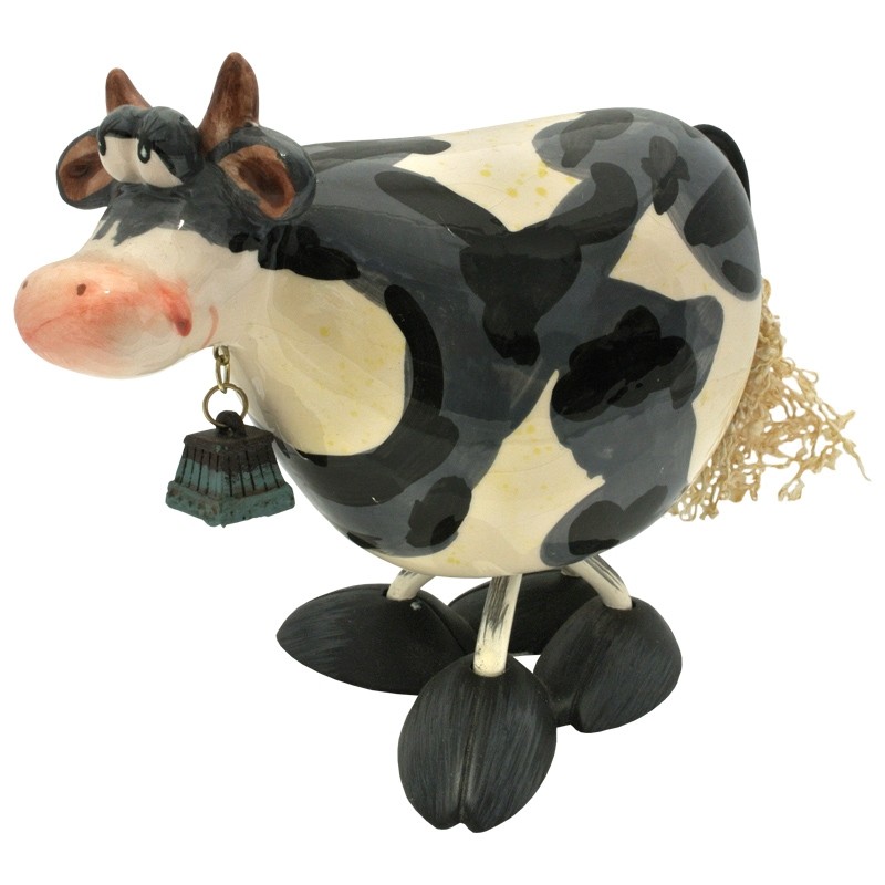 Фарфоровая фигурка милой коровки с колокольчиком и очень выразительными глазами. Фигурка коровки на пружинах и при нажатии весело покачивается и подпрыгивает. Такая статуэтка порадует оригинальностью Вашего близкого человека, хорошо впишется в любой интерьер.
