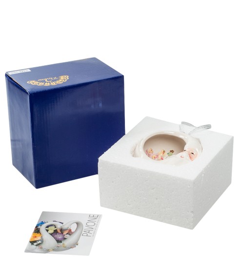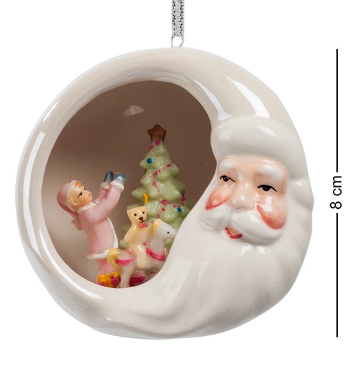 В центре этой подвесной композиции – новогодняя обстановка. Маленькая девочка в шубке, похожая на Снегурочку, наряжает игрушками новогоднюю елочку. Рядом – подарки, игрушки и лошадка-качалка: ведь Новый год – пора сюрпризов. И за всем этим внимательно наблюдает Дед Мороз, белая борода которого метелью окружила весь мир. Но девочке холод не угрожает, напротив, добрый зимний волшебник обогрет ее: ей будет уютно и тепло играть возле наряженной елочки. Эта фарфоровая фигурка выполнена в виде подвески, так что она и сама может послужить в качестве елочной игрушки, символом зимы и праздника.