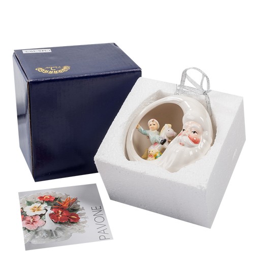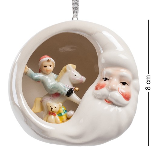 Зима – час суворих снігових хуртовин, але ж вона – і пора новорічних свят, подарунків, ігор на снігу. Ось ця порцелянова підвіска каже, що в снігових вихорах, що звиваються спіралями, проглядає добре обличчя зимового чарівника Діда Мороза, а трохи осторонь хуртовини, у теплій кімнаті, діти радіють подарункам, скачуть на дерев'яних конях. І ковпачок на голові у маленького хлопчика нагадує, що це – Новий Рік, що прийшов у наші будинки. Таку підвіску можна просто повісити на стіну, а можна використовувати і як ялинкову іграшку – тематика цілком відповідає, та й Діду Морозу таке розташування явно сподобається.