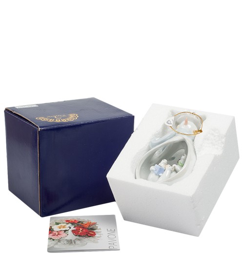 В центре этой подвесной композиции – новогодняя обстановка. Маленькая девочка в шубке, похожая на Снегурочку, наряжает игрушками новогоднюю елочку. Рядом – подарки, игрушки и лошадка-качалка: ведь Новый год – пора сюрпризов. И за всем этим внимательно наблюдает Дед Мороз, белая борода которого метелью окружила весь мир. Но девочке холод не угрожает, напротив, добрый зимний волшебник обогрет ее: ей будет уютно и тепло играть возле наряженной елочки. Эта фарфоровая фигурка выполнена в виде подвески, так что она и сама может послужить в качестве елочной игрушки, символом зимы и праздника.