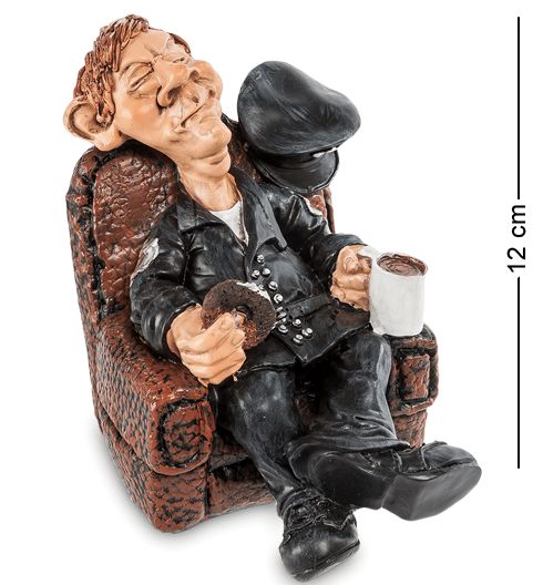 Цікава фігурка бравого поліцейського, котрий явно тільки змінився з патрулювання міських вулиць, де темно, холодно, ллє дощ і хочуть неприємні особистості, з якими треба боротися. І ось - піст зданий, можна сісти, налити собі чашку кави, прихопити м'який бублик з маком і влаштуватися в м'якому кріслі, вперше за день повністю розслабившись.