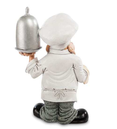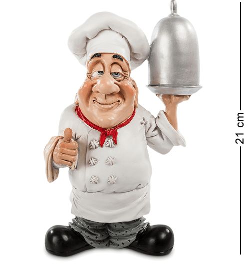 Памятный подарок настоящему кулинару, профессионалу своего дела. Эта статуэтка повара приготовила вам сюрприз. Солидный дядя в белом подпоясанном халате и поварской шапке на голове принес прямо из кухни тарелку, содержимое которой скрывает накрывающий ее колпак. Но там явно скрывается то-то особо вкусное – не зря повар улыбается и большой палец всем показывает, мол, сейчас вы все ахнете, такую я вам красоту принес.