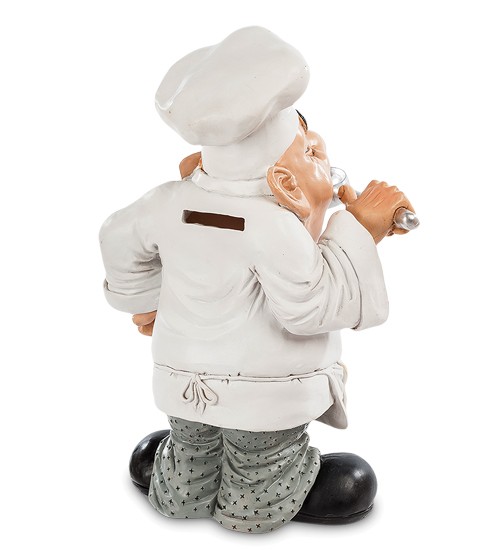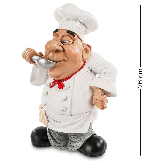 Вот и пробует повар свое творение, зачерпнув ложкой, а на лице написано предвкушение – ох, и блюдо получается! Интересные статуэтки поваров – прекрасные подарки: любому повару будет приятно получить такую забавную фигурку от своих родных, близких или от коллег по работе.