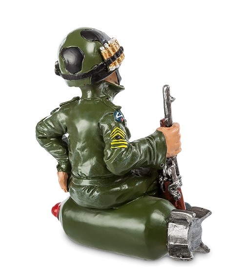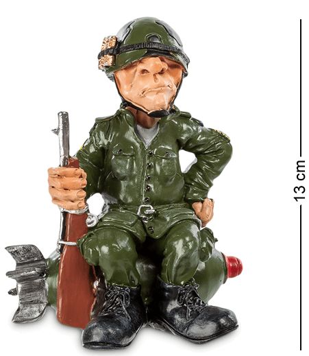 Якщо ситуація неясна, лягай спати - говорить солдатська приказка, і фігурка солдата чудово відображає принцип «Солдат спить - служба йде». Насунути шолом на очі і можна подрімати, ніхто й не помітить. Рушниця в руках, можна зробити вигляд, що він на посту стоїть, охороняє цю бомбу, на яку присів.А насправді просто сів на те, що підвернулося: диванів-то в армії не буває. Ось так і протікає мирна солдатська служба – відпочивати треба вміти будь-якої миті, коли для цього видається хоч хвилина. Подарувати фігурку бравого вояки можна демобілізованому солдатові – він згодом з ностальгією згадуватиме свою службу.