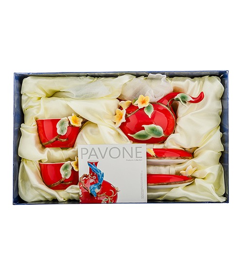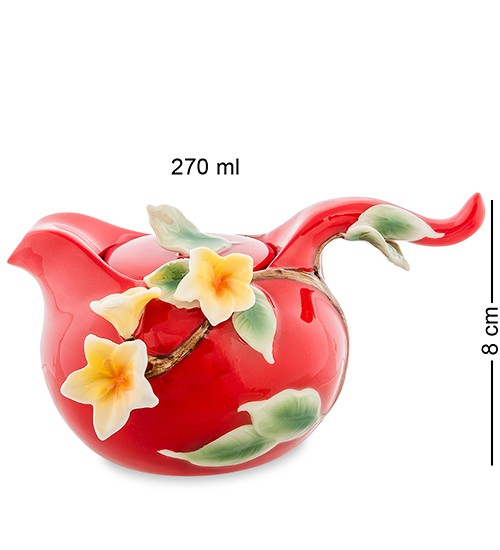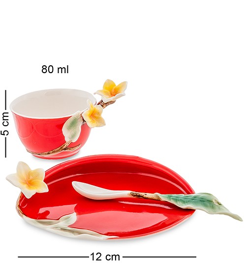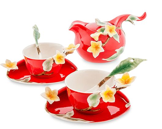 Ярко-красная поверхность сервиза украшена бело-желтыми цветами тропического франжипана. Побеги выходят из чашек, цветы распускаются во всех направлениях, а ручки ложечек выполнены в форме листьев. Везде побеги, листья, цветы – всё излучает жизнь и приглашает к чаепитию. Внутренняя белая поверхность чашек создает поразительный контраст и позволяет оценить цвет налитого чая. Из такого набора можно пить только с праздничным настроением.