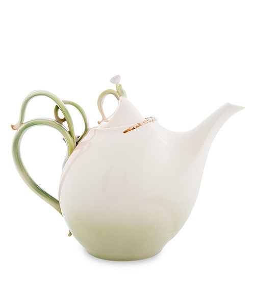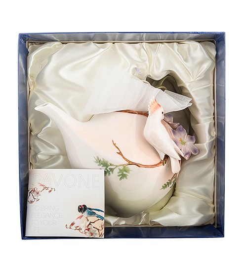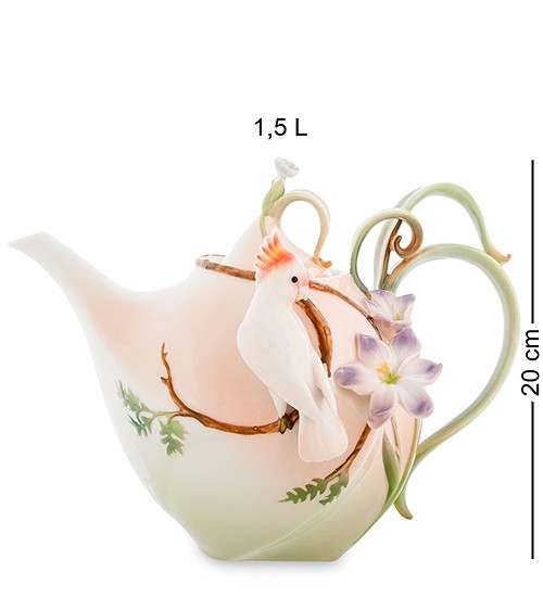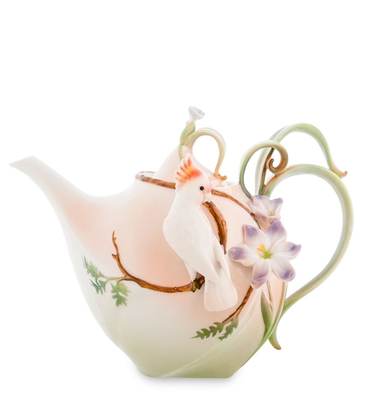 Причудливыми ветками цветущего дерева оплетен этот чайник. Они повторяют форму ручки, заходят на носик и оканчиваются цветком на вершине крышечки. И кажется совершенно естественным, что на такую природную красоту прилетел попугайчик удивительной красоты.