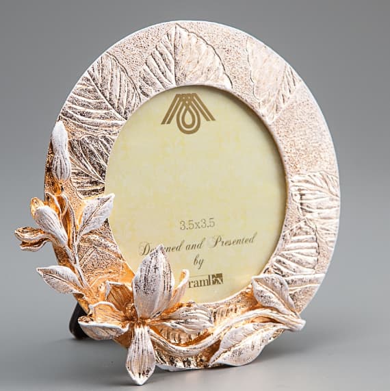 Фоторамка (колір зістареного золота) для фото розміром 8х8см. Настільна рамка зі склом та з ногою-підставкою. Розмір овальної рамки: 14х14см, товщина 3см. Виготовлена ​​з полістоуну (легкий штучний камінь).