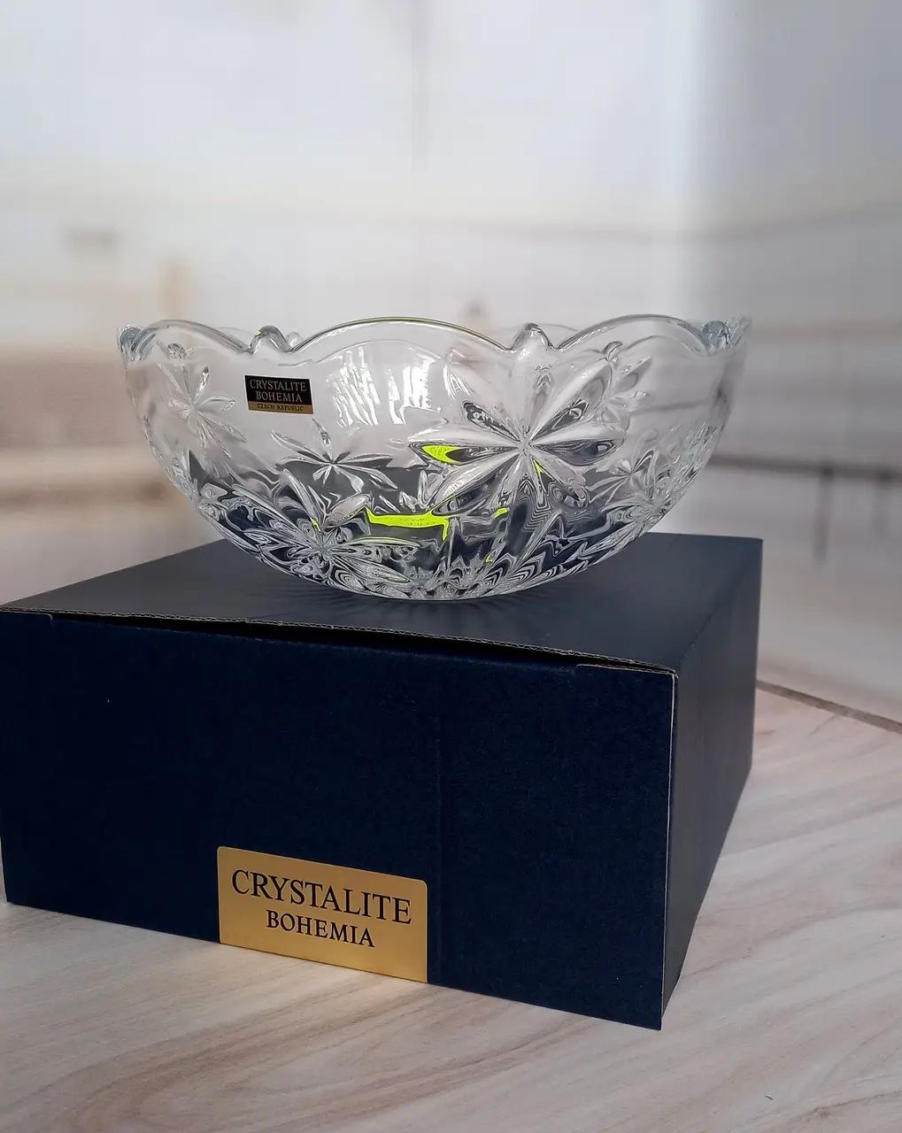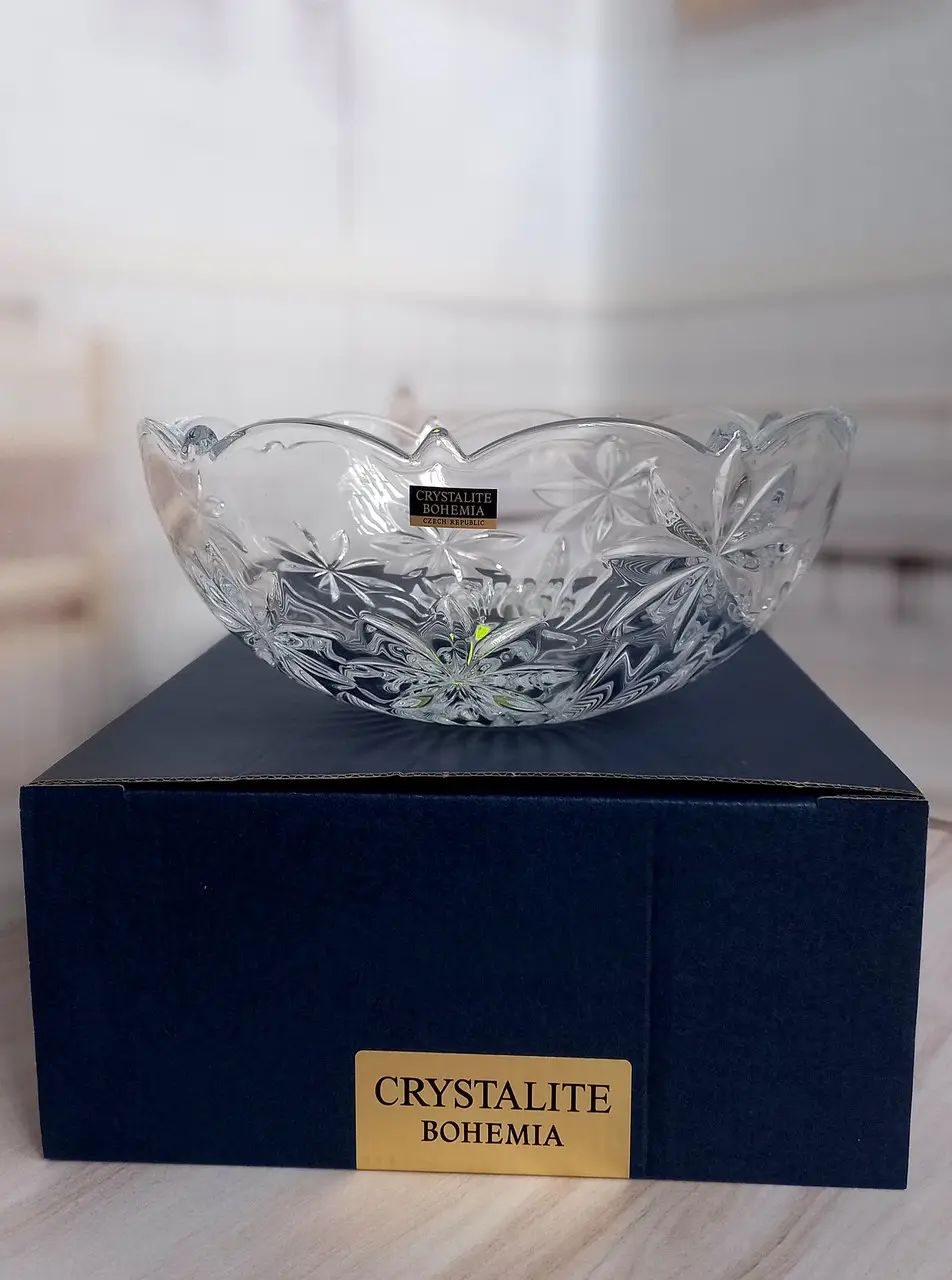 Превосходное блюдо для салатов, настоящее украшение стола. Богемское хрустальное стекло - это всемирно известный продукт высокого качества, произведенный в Чехии. Широкий ассортимент продукции включает в себя посуду каждодневного использования, а так же эксклюзивные предметы, изготовленные вручную. Отличительной особенностью богемского хрусталя является отсутствие свинца, что обеспечивает безопасность Вашего здоровья. Вместо свинца используется оксид титана, который придает прочность посуде и стойкость к истиранию.