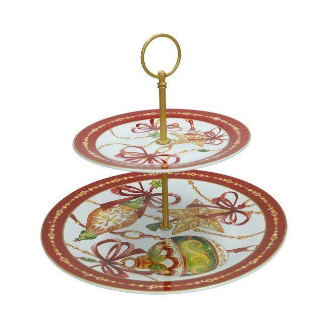 Ця двоярусна фруктівниця миттєво створює святковий настрій завдяки яскравому орнаменту з новорічних іграшок та червоних стрічок. Нижній ярус діаметром 27 см і верхній рівень дозволяють красиво викласти фрукти, тістечка чи солодощі. Висота конструкції становить 24 см, тому вона виглядає ефектно та не займає зайвого місця на столі. Тонкий високоякісний фарфор видає приємний кришталевий дзвін під час дотику й елегантно переливається на світлі. Малюнок нанесений методом надміцного відбитка і не стирається з часом. Фруктівницю можна використовувати в посудомийній машині та мікрохвильовій печі, уникаючи абразивних засобів під час ручного догляду.