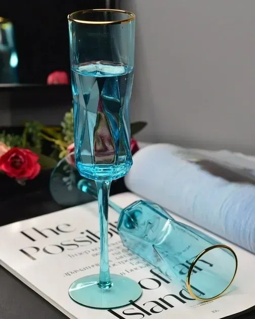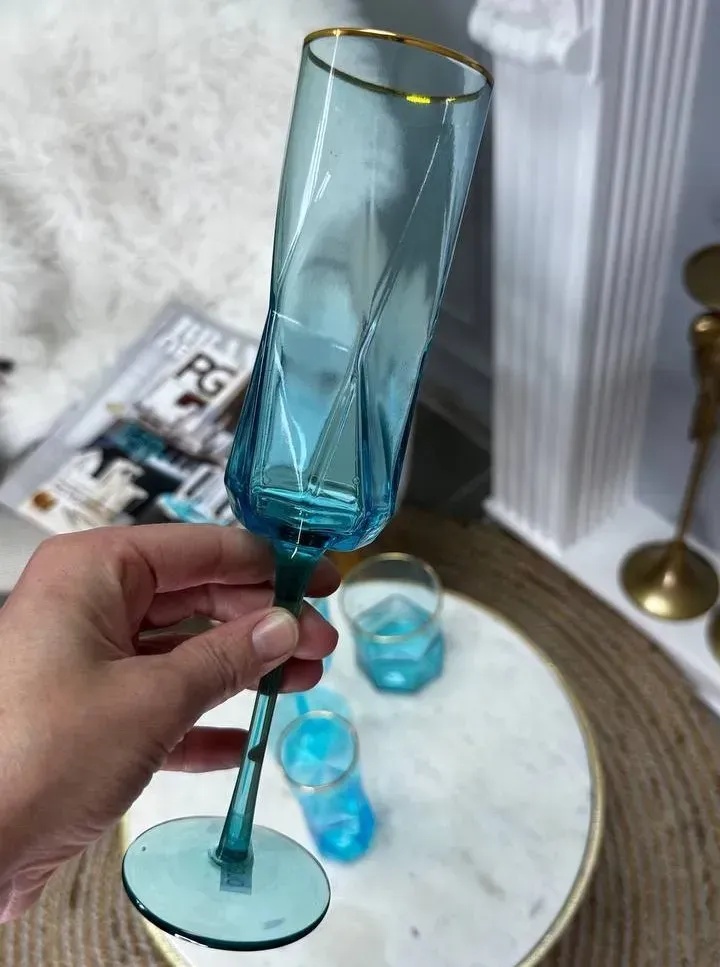 Эти бокалы и стаканы словно созданы, чтобы подчеркнуть характер каждого напитка — будь то холодный лимонад, игристое шампанское или освежающая вода с долькой цитруса. Грани стекла словно играют со светом, а голубой цвет будто переносит вас в морское утро, наполненное прохладой и ясностью.