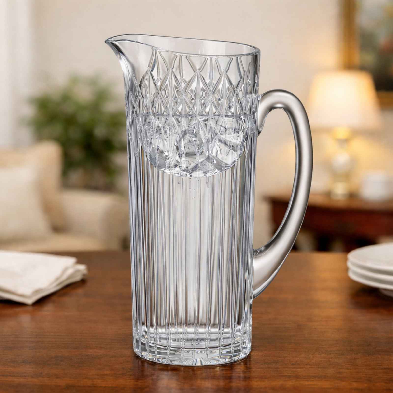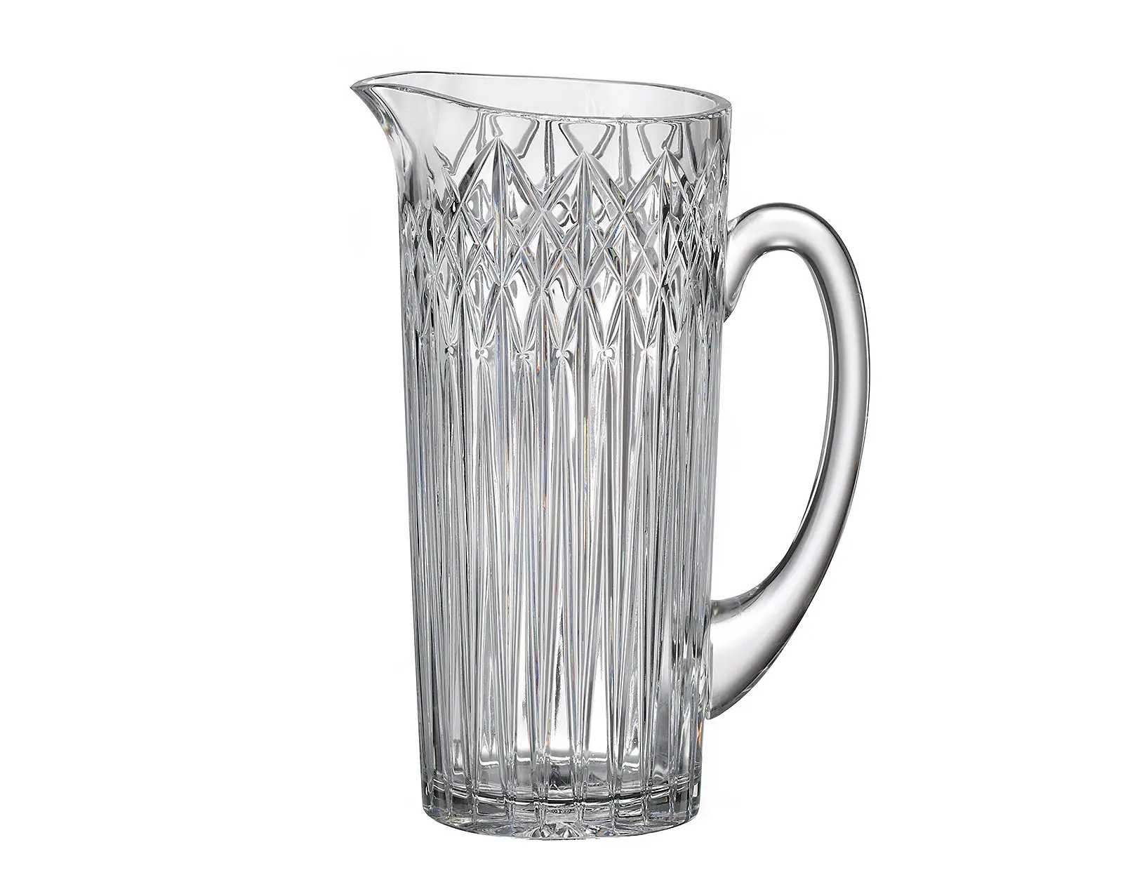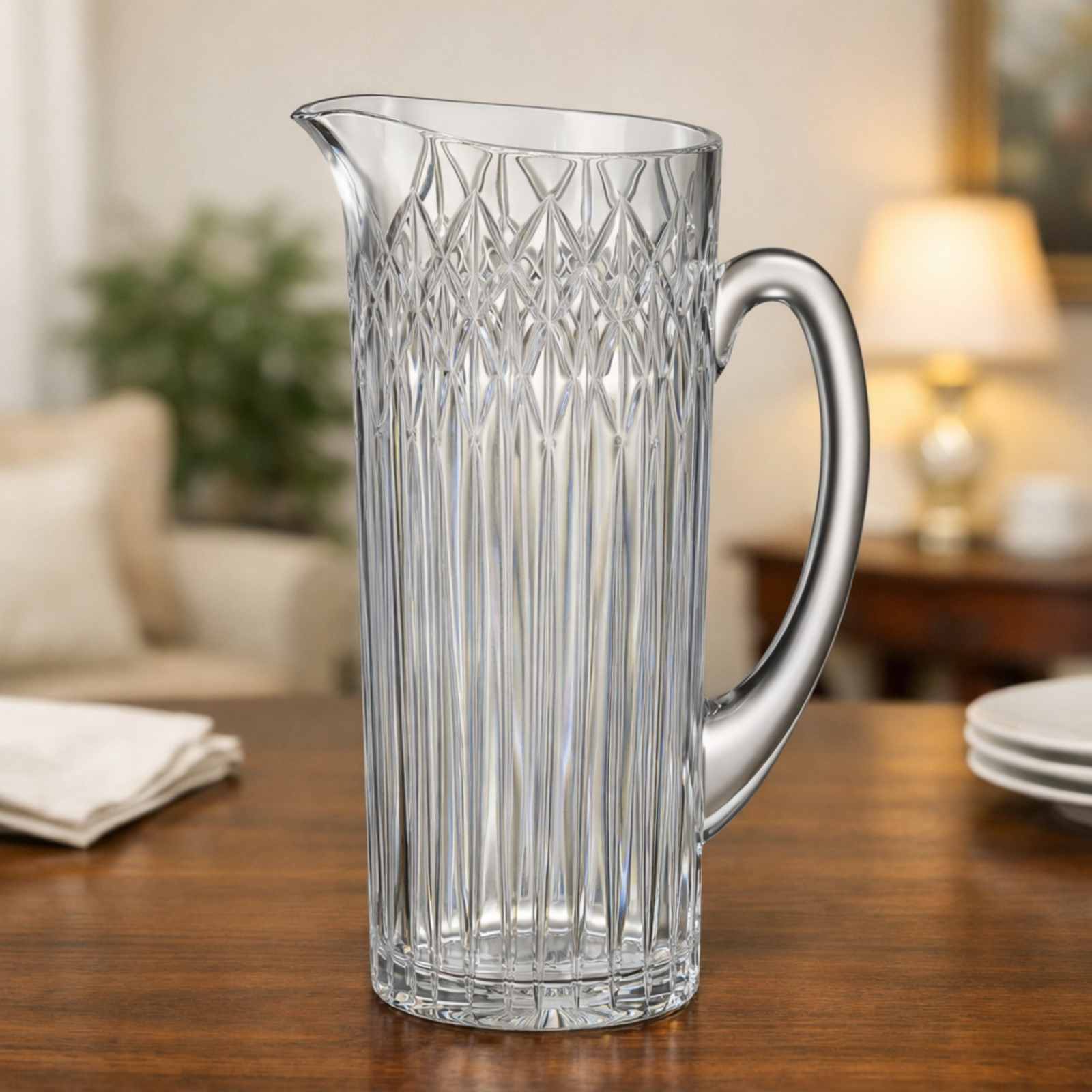 Глечик з екокришталю прозорий Lenas 1,15 л привертає увагу елегантним силуетом і виразним рельєфним декором. Вертикальні грані та ромбоподібний візерунок у верхній частині створюють ефектну гру світла, підкреслюючи чистоту й прозорість матеріалу. Акуратний носик забезпечує рівне та комфортне наливання, зберігаючи охайний вигляд сервірування.