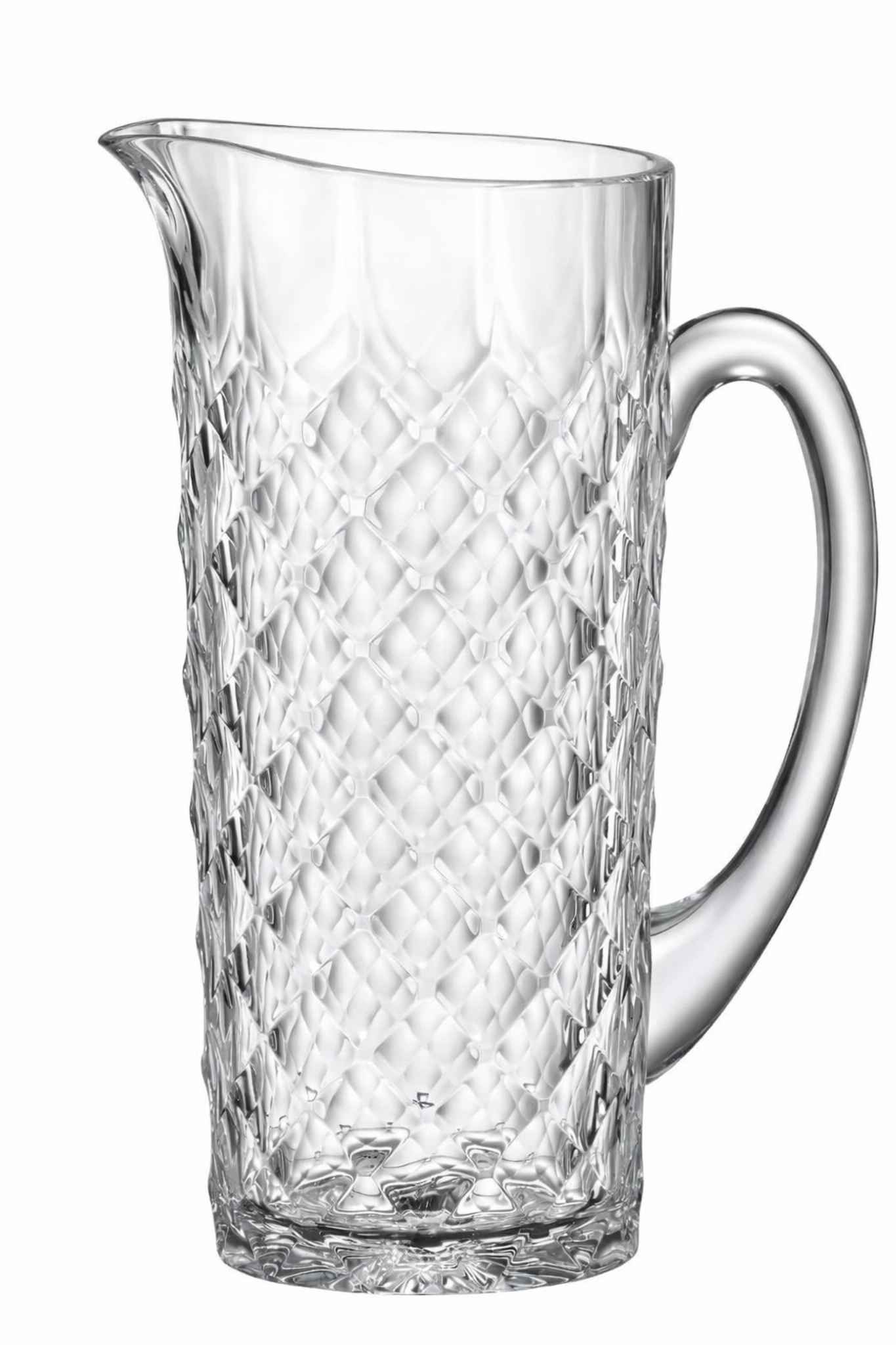 Прозорий глечик Tiny з екохришталю об’ємом 1,15 л — це ефектне поєднання практичності та виразного дизайну. Рельєфна поверхня з геометричним візерунком красиво заломлює світло й підкреслює чистоту матеріалу, а витягнута форма робить глечик візуально легким та елегантним. Акуратний носик забезпечує зручне й точне наливання, а прозорі стінки дозволяють ефектно подавати напої, демонструючи їхній колір і текстуру.