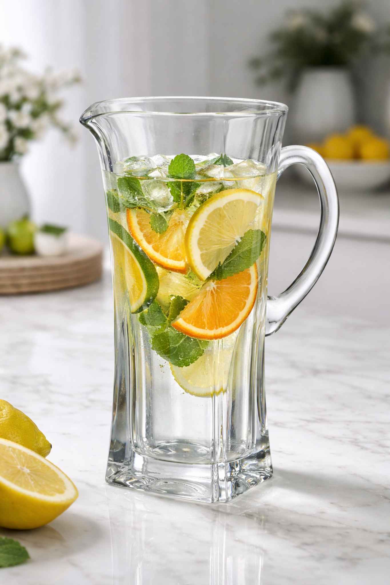 Практичний об’єм 1 літр робить його універсальним: у ньому зручно подавати воду, соки, морси, лимонади, компоти чи освіжаючі коктейлі. Потовщене скло гарантує міцність, а широка ручка забезпечує комфортне використання й надійний захват. Спеціальний витончений носик полегшує наливання, запобігаючи проливанню навіть найлегших напоїв.