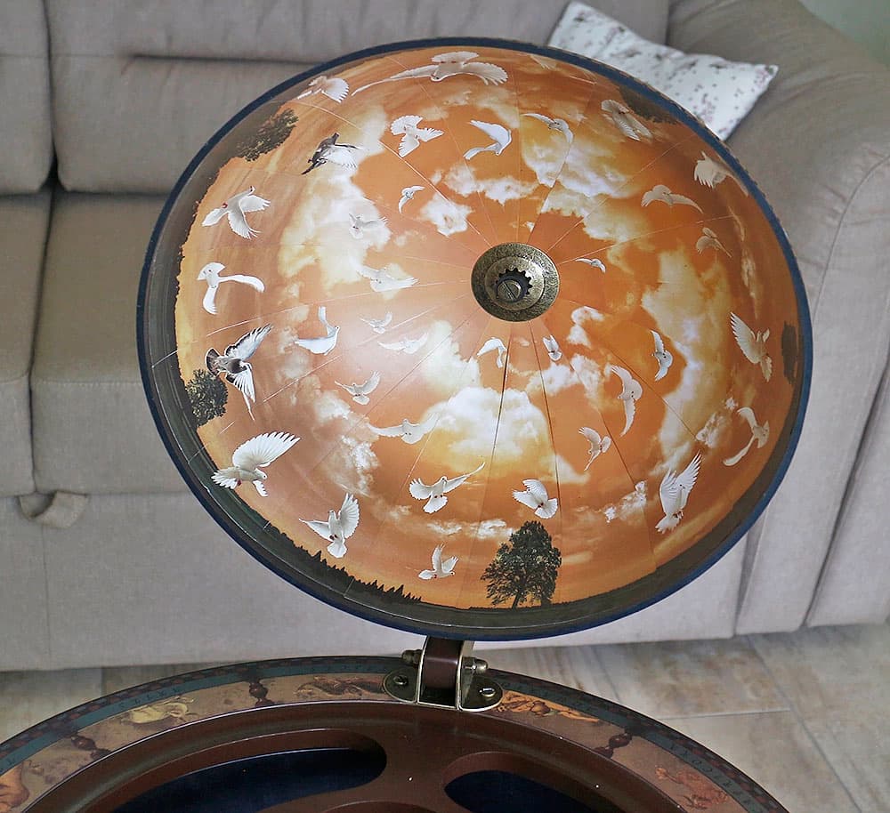 Глобус бар напольный диаметром 33 см-Зодиак кремового цвета с коричневыми ножками. Глобус идет на трех ножках, внутри сферы четыре отделения под бутылки. Благодаря колесикам очень удобный в перемещении.