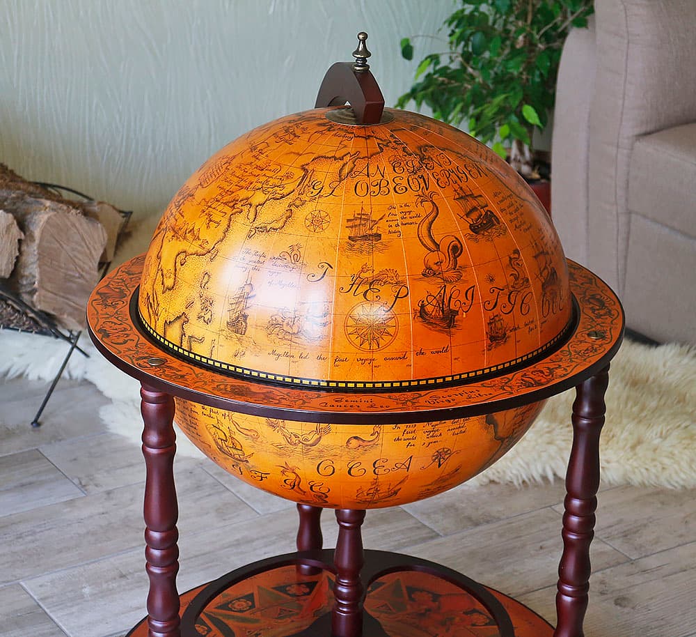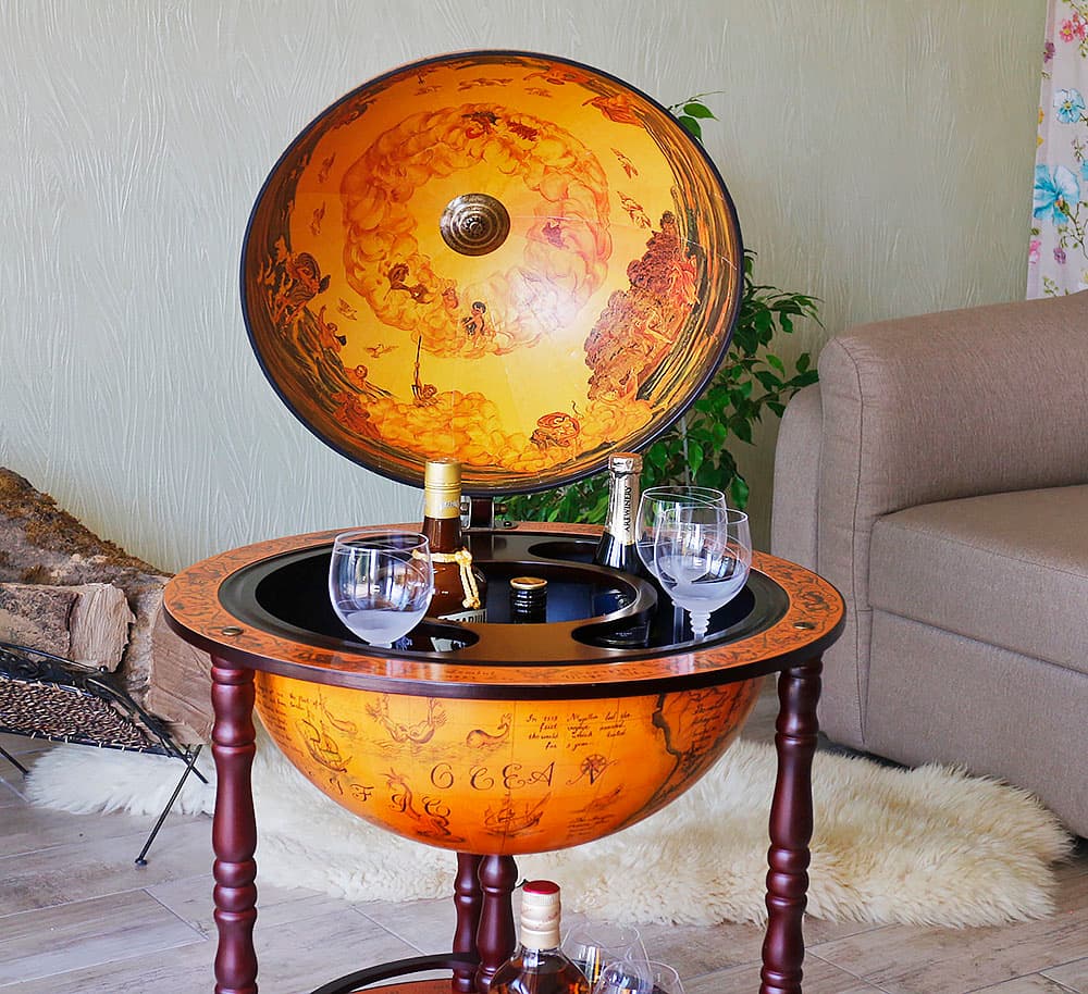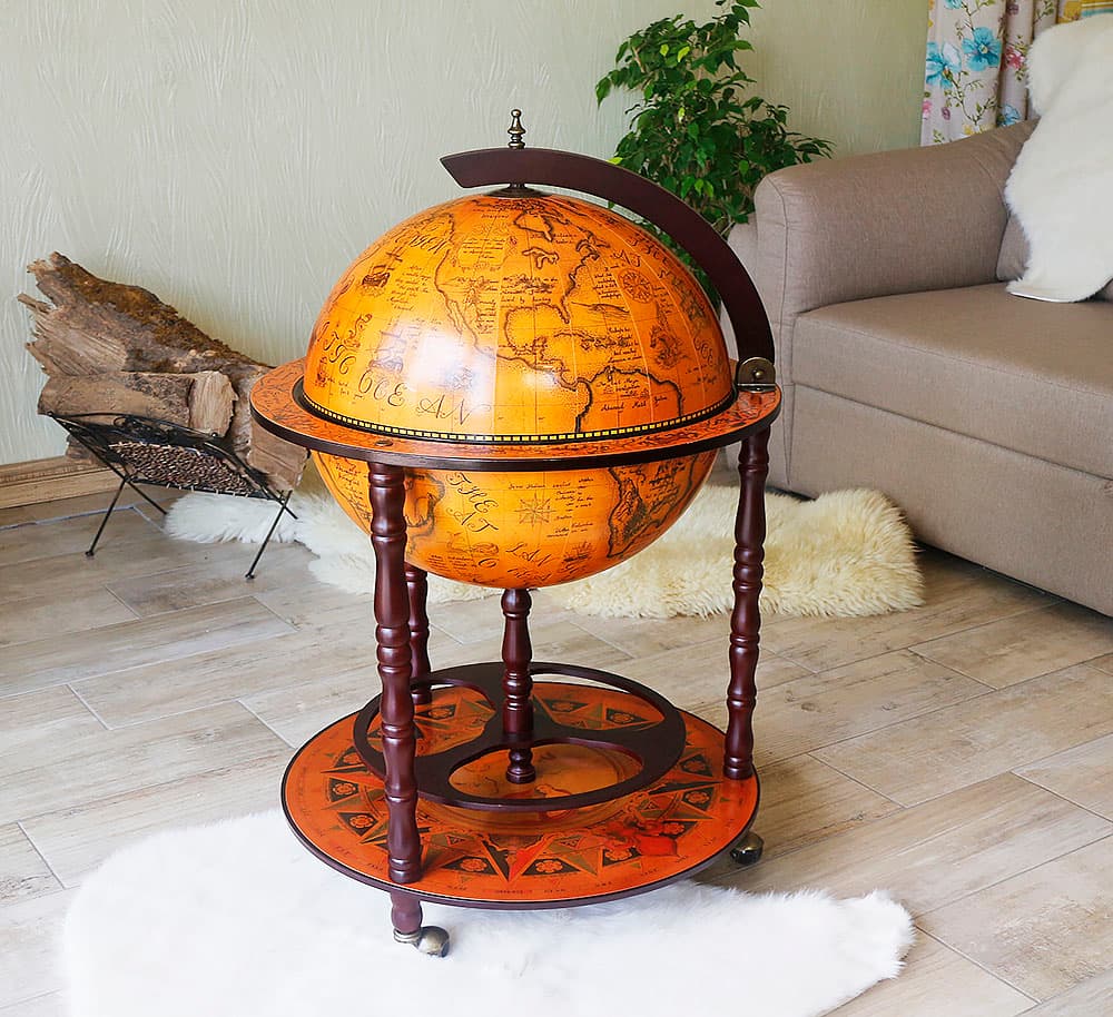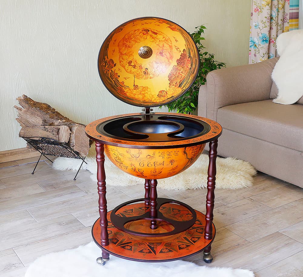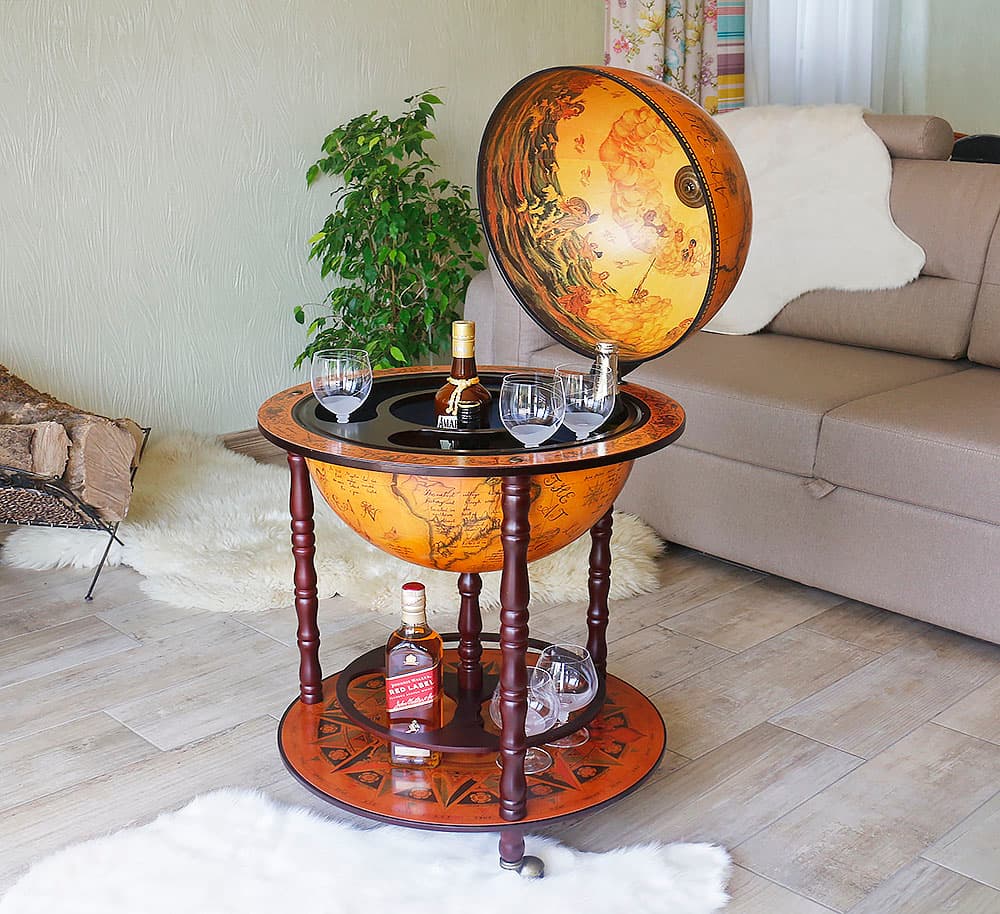 Какой бар купить или обустроить в рабочем кабинете человеку, который часто принимает посетителей в неформальной обстановке? Пожалуй, наиболее компактным вариантом станет настольный или напольный бар например, стилизованный под глобус. Три ноги, лаконичные формы, удобные основы и аристократичный экстерьер данной модели играют на руку хозяину дома.