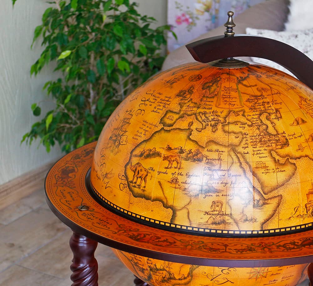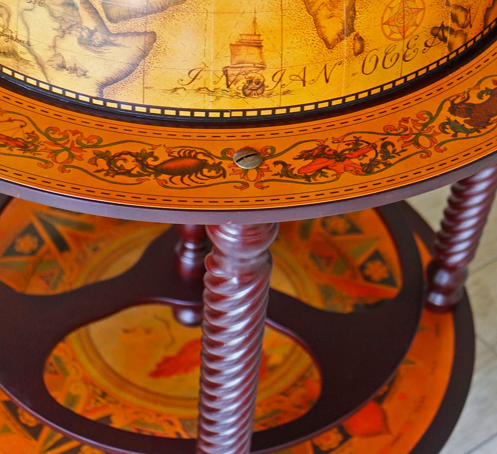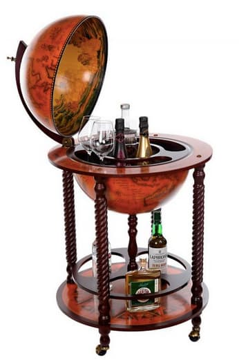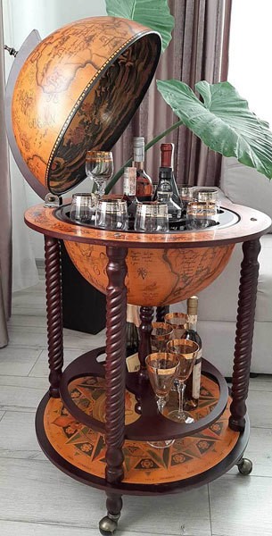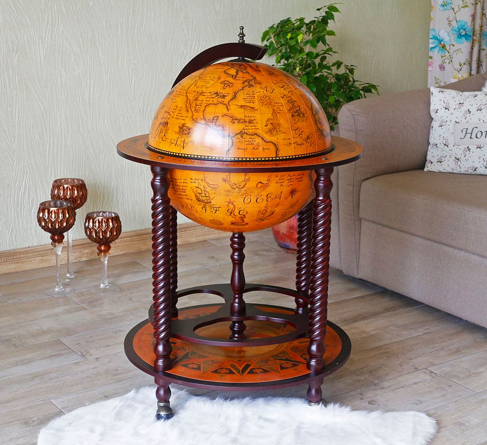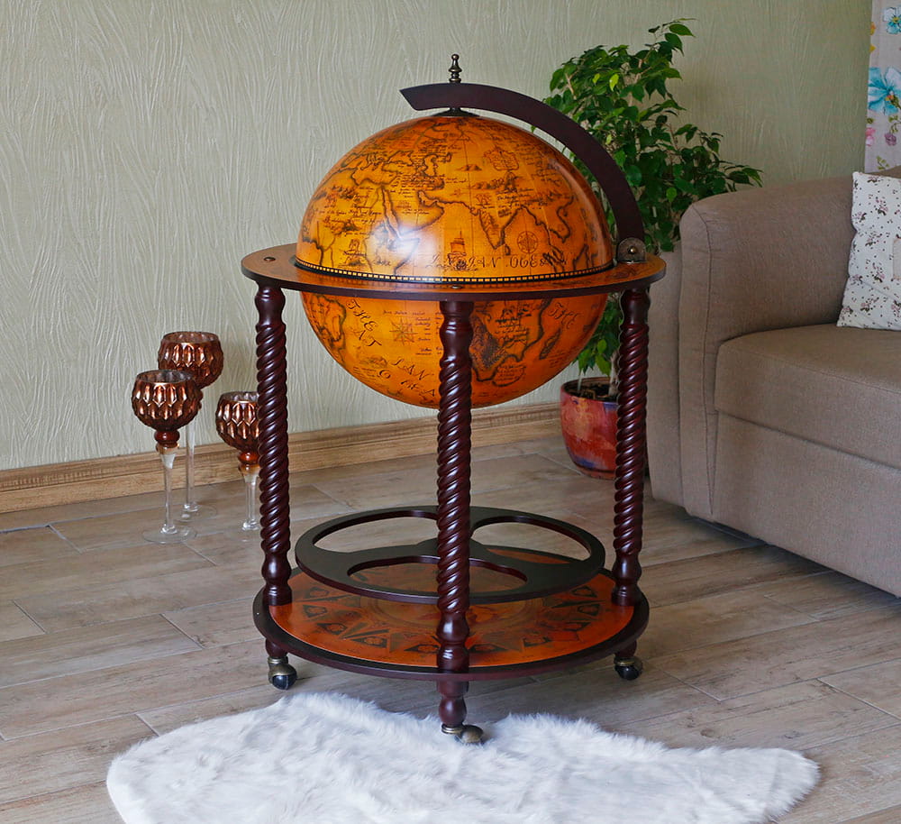 Глобус бар це не тільки предмет, що виконує свою пряму функцію зберігання напоїв та аксесуарів. Це річ, яка підкреслить Ваш інтер'єр, внесе в нього родзинку та трохи вишуканості та шарму. Ви можете вибрати його залежно від стилістики вашого інтер'єру. Так, наприклад, є мінімалістичні бари, виконані в одній гамі кольорів і без додаткових прикрас. І навпаки, бари, виконані з додаванням прикрас, або позолоти, зі статуями у своїй основі, які ніби тримають земну кулю. Такі варіанти більше підійдуть для інтер'єру в античному стилі, і чудово гармоніюватимуть із загальним дизайном Вашого будинку.