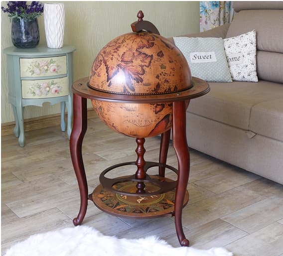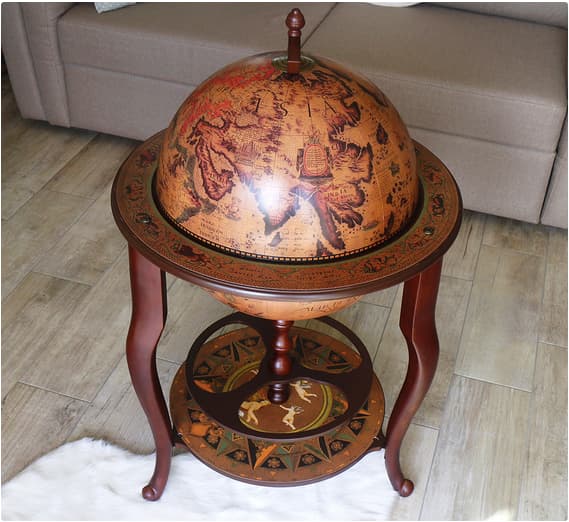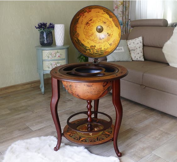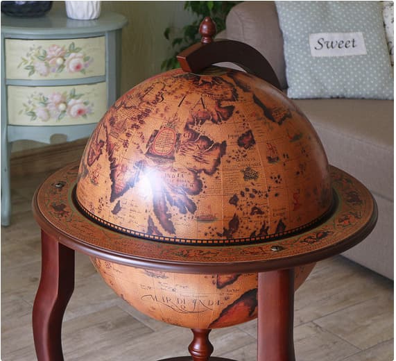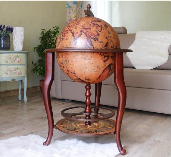 Глобус бар – это предмет интерьера, который точно Вам понадобится, если вы коллекционируете бутылки с напитками разного сорта, любите, чтобы они были размещены аккуратно и компактно, при этом украшая Ваш дом, и не привлекая лишнего внимания Элиная модель Глобус бар напольнного на 3 ножка в цвете красное дерево, крышка выполнена с картой мира и внутренная часть бежевом цвете