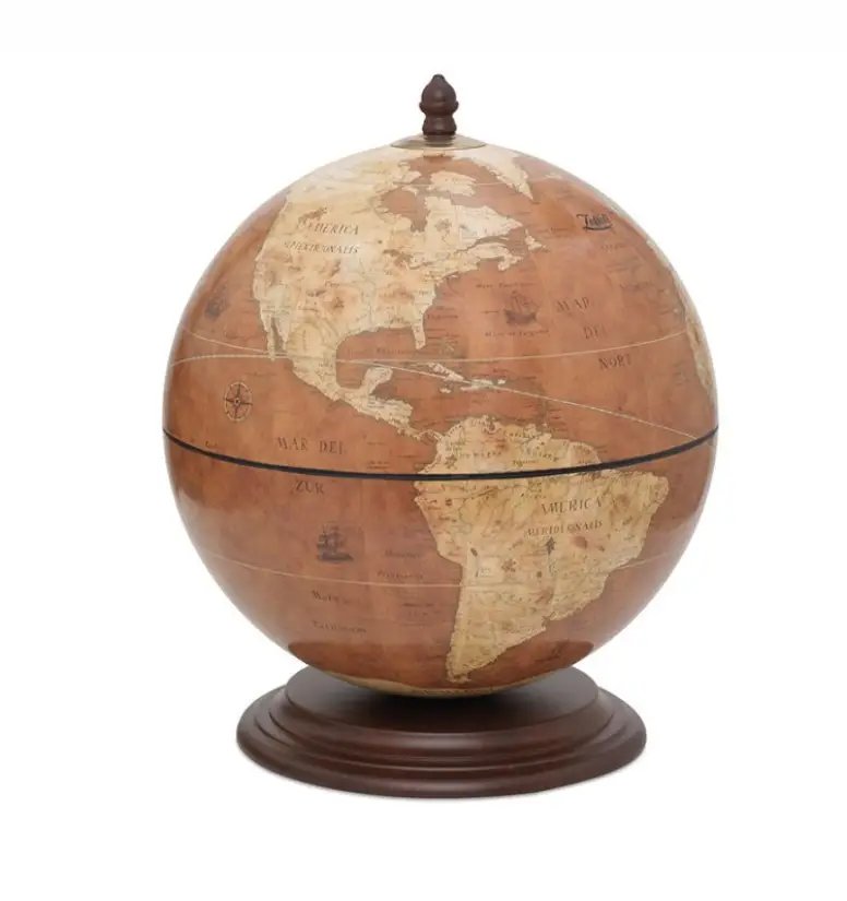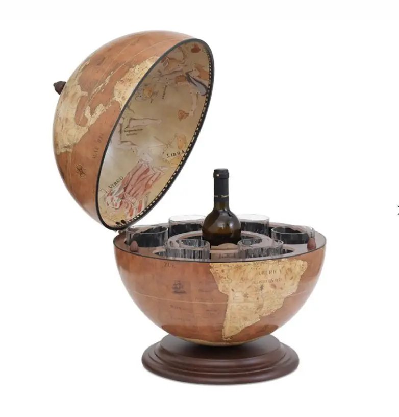 Основа бару виготовлена з натурального дерева, покритого шпоном, що забезпечує надійність конструкції та довговічність виробу. Висота глобус-бару становить 50 см, а діаметр кулі — 40 см, що робить його компактним і водночас достатньо містким. Завдяки настільному формату його легко розмістити в кабінеті, вітальні або навіть на консолі біля дивана.