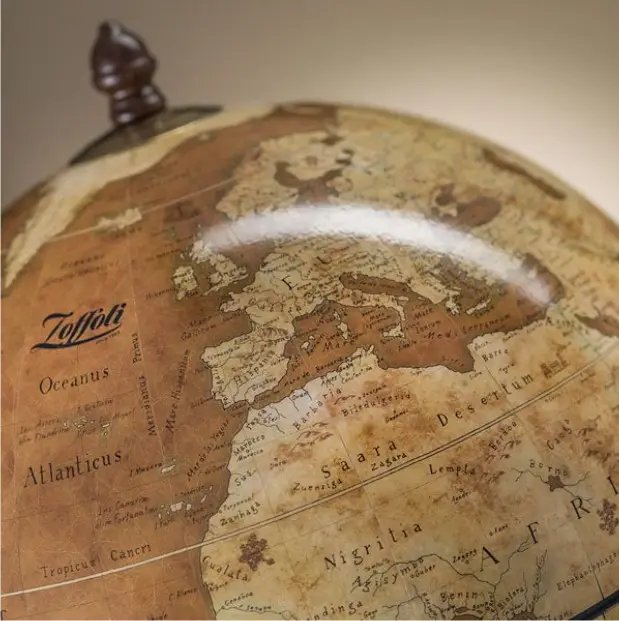 Розкішний настільний глобус-бар Zoffoli Giove-Rust — це не просто функціональний предмет інтер’єру, а справжній витвір мистецтва з італійським характером. Він вражає своєю естетикою: купольна куля оздоблена історичною картою світу з ефектом "під старовину", а внутрішня частина розписана античними сюжетами. Кожна деталь створює атмосферу елегантного ретро і підкреслює добрий смак власника.