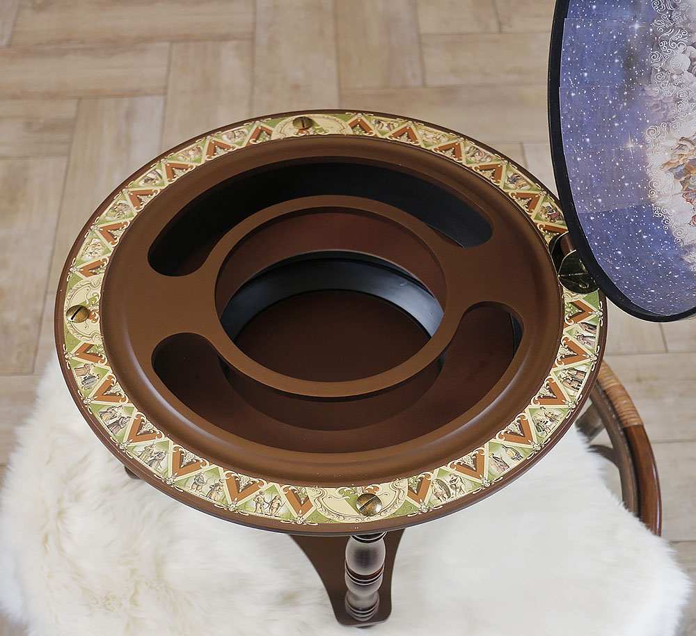 Настольный глобус-бар со сферой кремового оттенка диаметром 33 см украшен детализированной картой мира, которая придаёт изделию выразительность и особый характер.