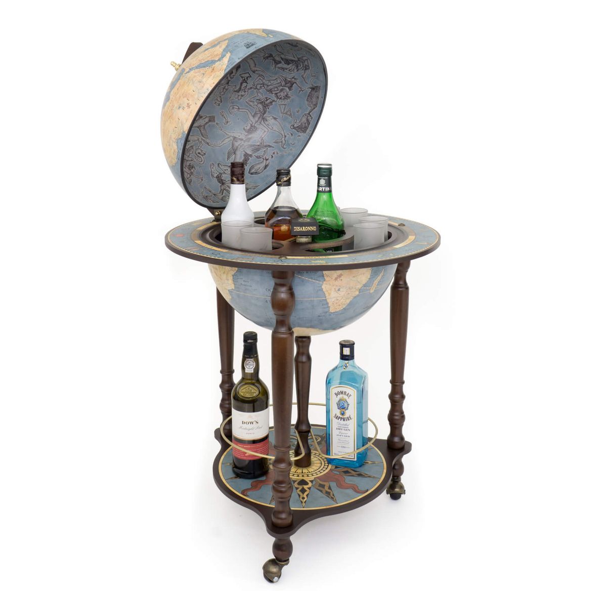 Нижня поличка з компасною розою — це не лише декор, а й функціональна деталь для зберігання додаткових аксесуарів чи напоїв. Бар легко переміщається завдяки чотирьом коліщаткам з фіксаторами — не пошкоджує підлогу і залишається стійким. Це не просто бар — це елемент стилю, символ добробуту й гарного смаку.