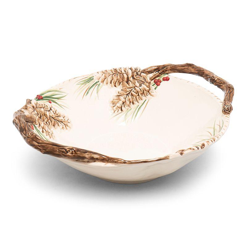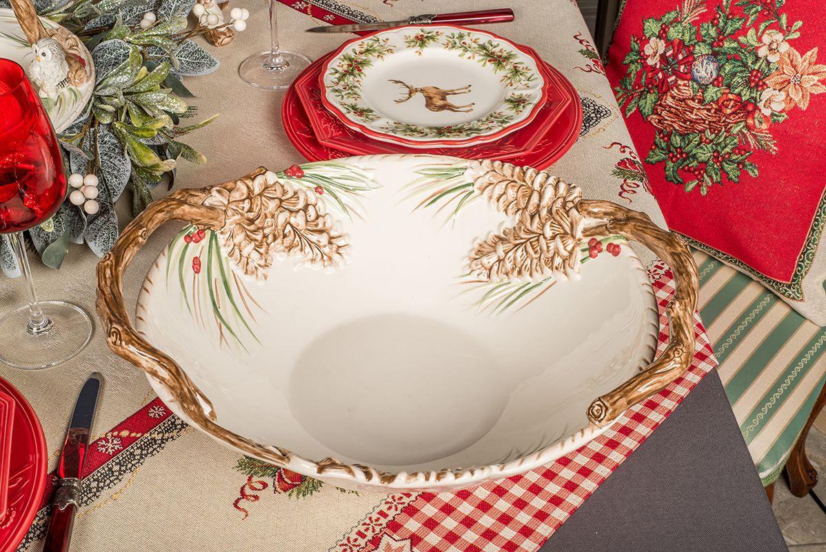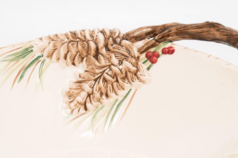 Біла поверхня – наче снігова кучугура, з-під якої видно гілки дерев та ялинові шишки. Червоні ягоди падуба вносять яскраві штрихи до спокійної зимової палітри. Фігурні декоративні елементи прикрашені ручним розписом, нанесеним пензлем художника-кераміста.