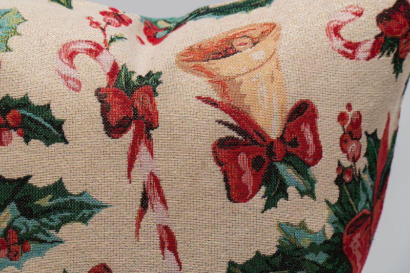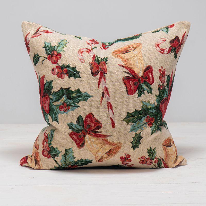 Глядя на эту потрясающую наволочку, можно услышать тонкий перезвон рождественских колокольчиков. На бежевом гобелене европейского производства разбросаны атрибуты приближающегося Рождества – звонкие колокольчики, ветки пуансеттии и леденцовые клюшки, украшенные красными бантами.