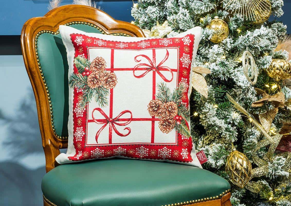 Наволочка из премиальной коллекции украсит дом и внесет уют и тепло. На плотном полотне вытканы еловые веточки с шишками. Вокруг светлого фона, сияющего нитями люрекса и перевязанного красной ленточкой, выполнена красная рамочка со снежинками.