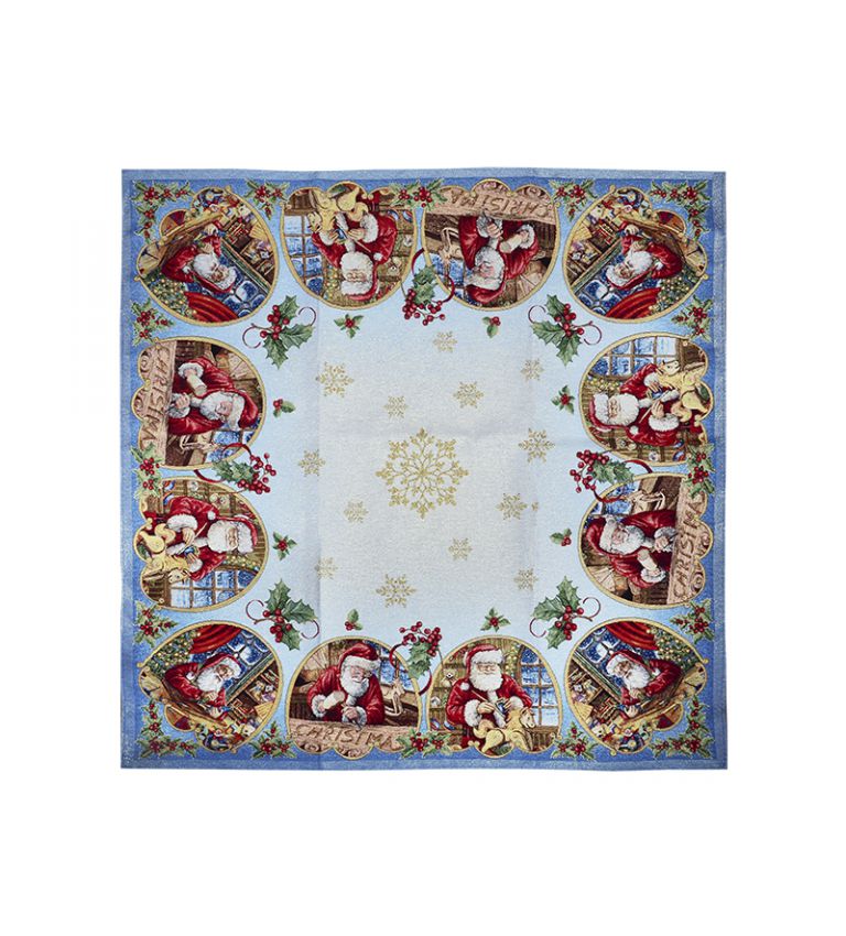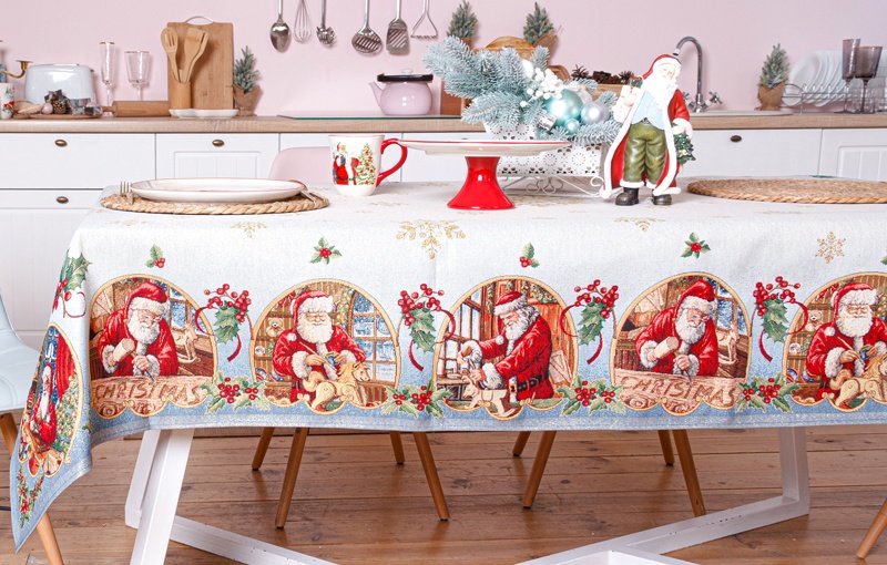 Гобеленовая новогодняя скатерть с люрексом «Готовлю подарки» — это изысканное украшение для вашего праздничного стола, которое создаёт атмосферу уюта и тепла. Яркий рисунок с изображением Санты за приготовлением подарков вызывает радость и предвкушение праздника, а золотистые нити люрекса придают текстилю особый блеск, который красиво играет в свете гирлянд и свечей.