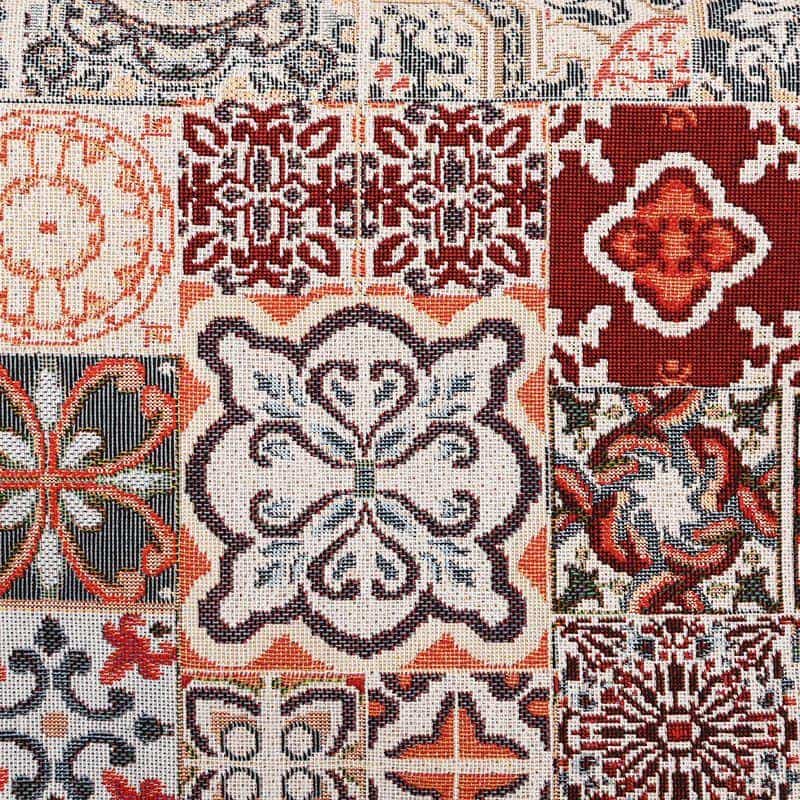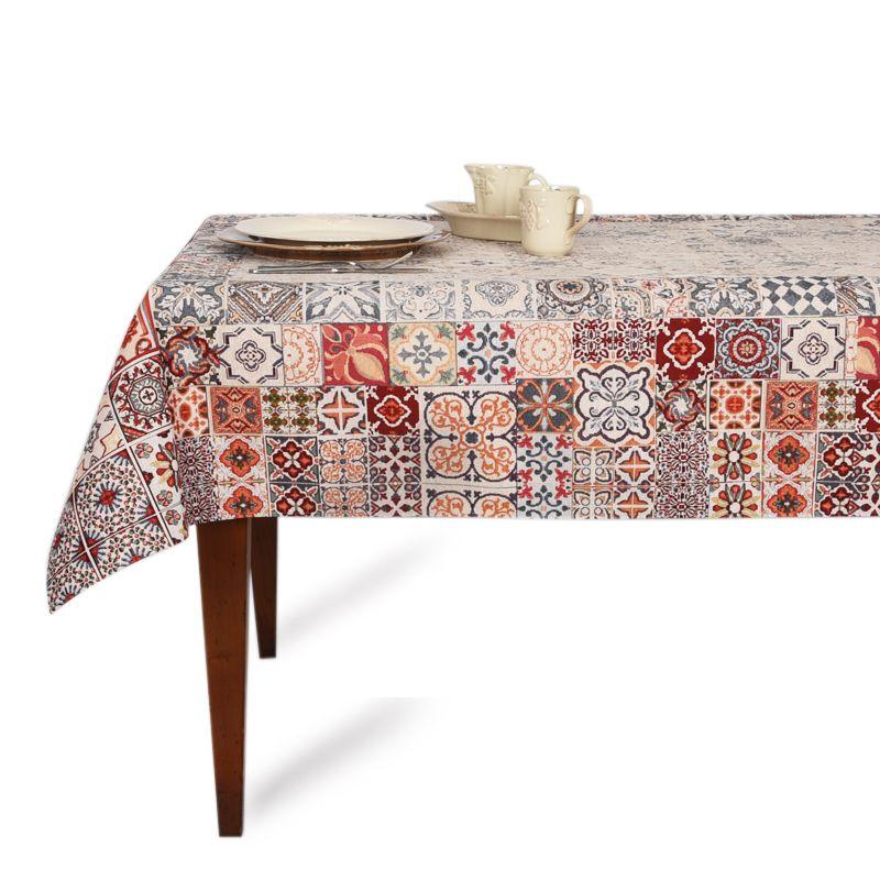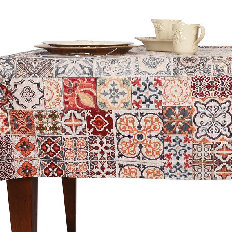 Оригінальна скатертина гобеленова, виконана в колоритному італійському дизайні. Умовно її можна поділити на дві частини - широку облямівку, яка спадає з краю столу і прямокутну основу, яка знаходиться на самій стільниці. Сервірування столу в середземноморському стилі дуже гармонійно виглядатиме на скатертині.